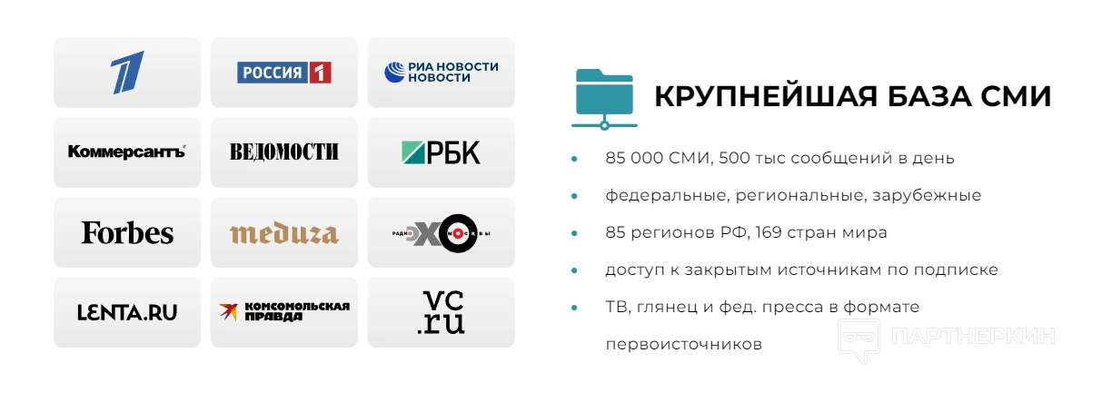 Охват базы включает федеральные, региональные и отраслевые источники, а также международные СМИ. Лингвистический анализ и прецизионный поиск обеспечивают немедленное выявление необходимых упоминаний компаний, персон и брендов, минимизируя информационные помехи.