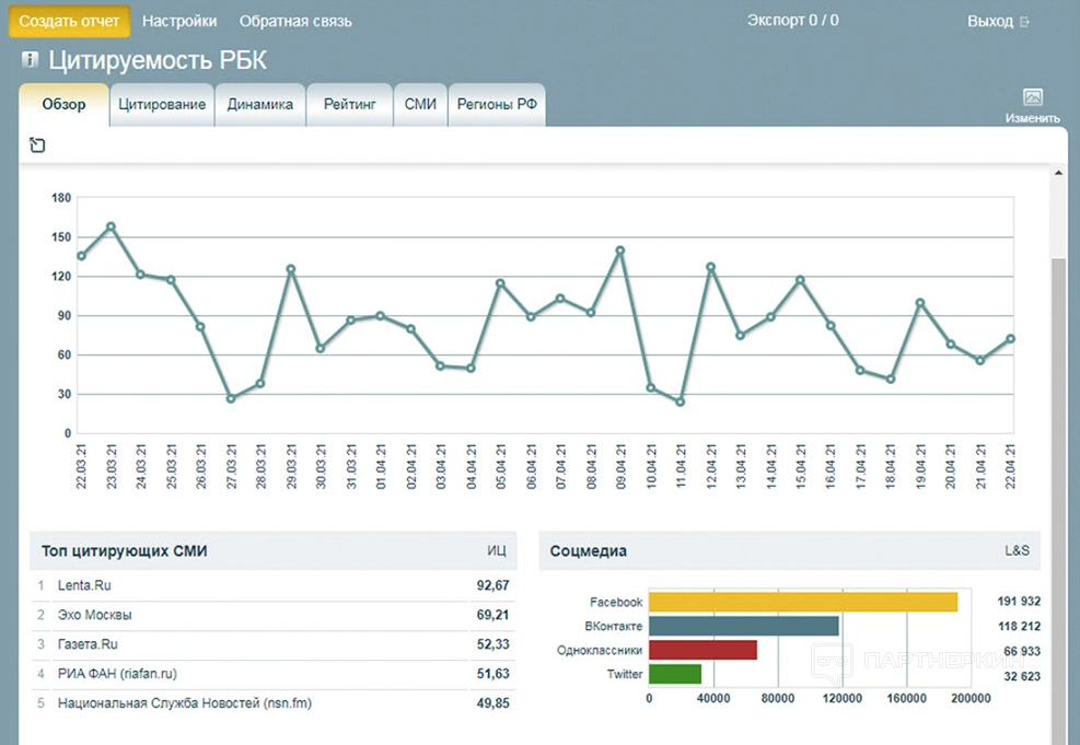 Сервис дает возможность отслеживать динамику показателей цитируемости по источникам и отдельным медиа. Набор готовых инструментов позволяет находить проверенные платформы для распространения контента и быстро собрать статистику для отчетов с удобным экспортом.