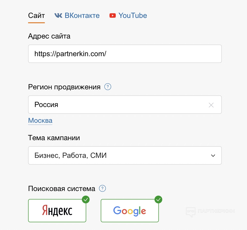 Далее указывается сайт, регион продвижения, темы кампании и нужные поисковики: