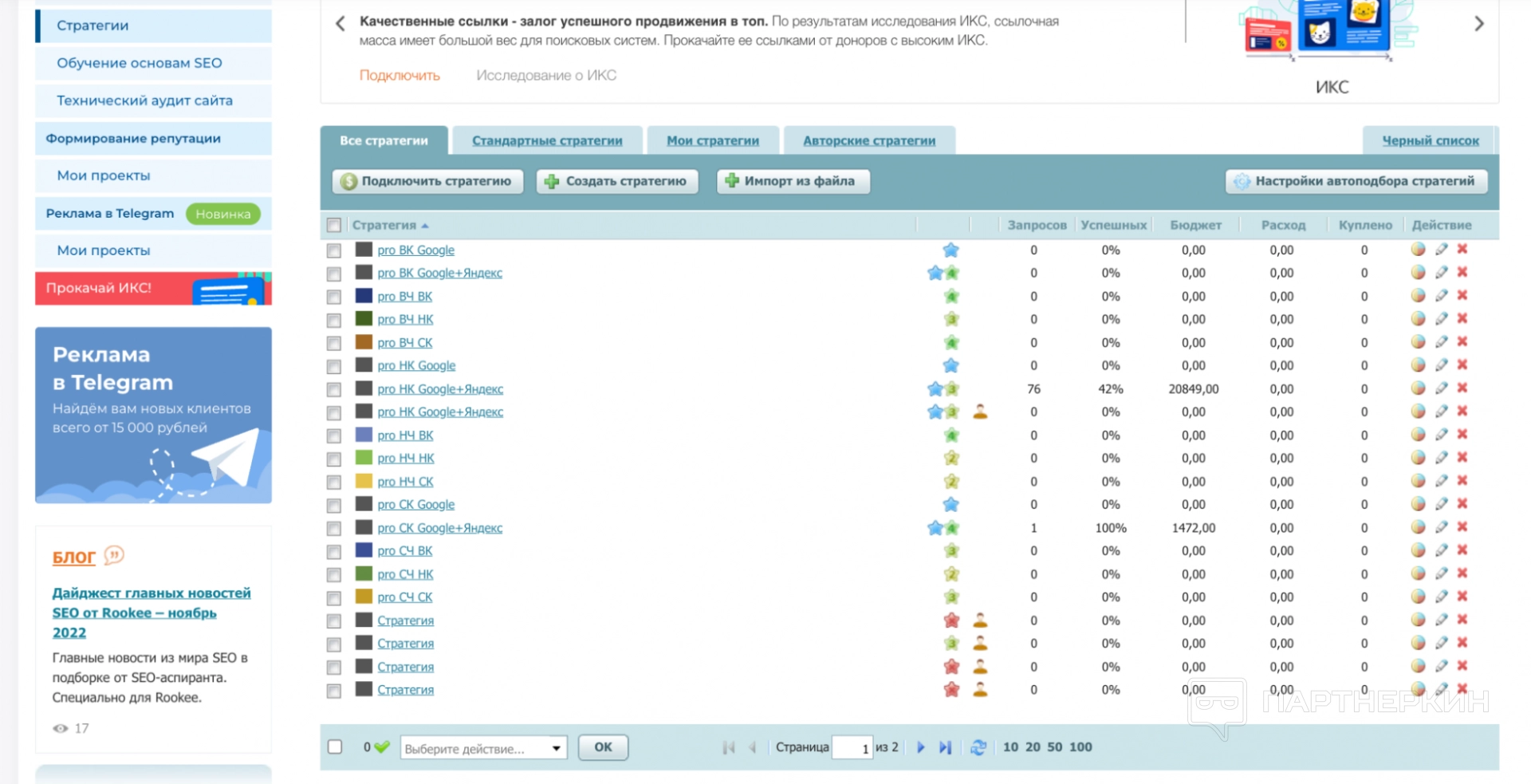 Ссылки закупаются автоматически, достаточно настроить стратегию и оплатить, дальше сервис все делает сам. В личном кабинете есть стандартные стратегии, но рекомендуется поиграть с настройками. Они гибкие и очень помогают все настроить под ваш сайт: белый и черный списки, ИКС донора, выбор доменной зоны, текст ссылок и количества страниц донора. Есть 7 крупных брокеров, у которых покупаются ссылки. Если какие-то брокеры не нравятся, их можно отключать.