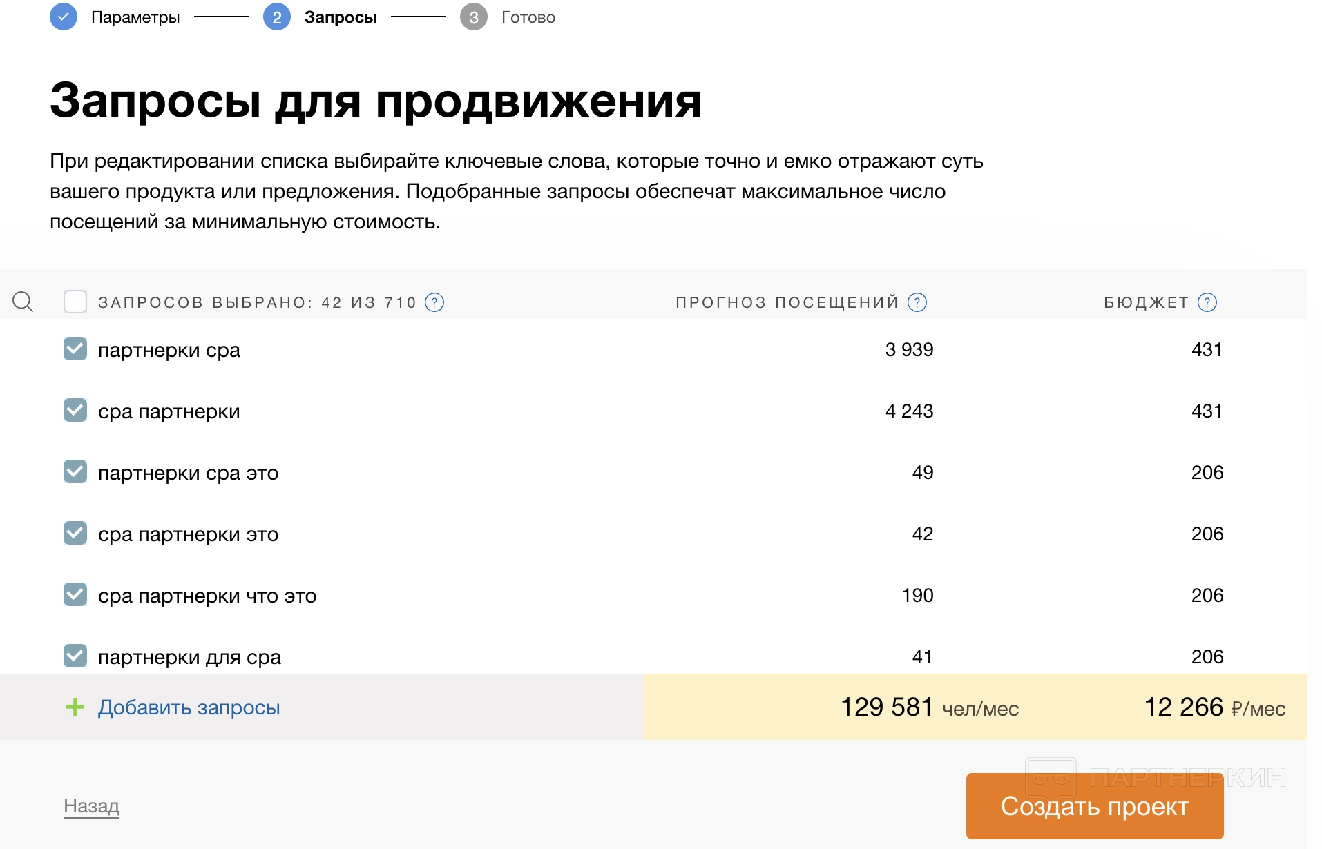Автоматически составляется список запросов (семантическое ядро). Запросы иногда дублируются, некоторые не идеально подходят, но их легко убрать, сняв галочку. Также можно внести свои запросы, если их нет в списке: