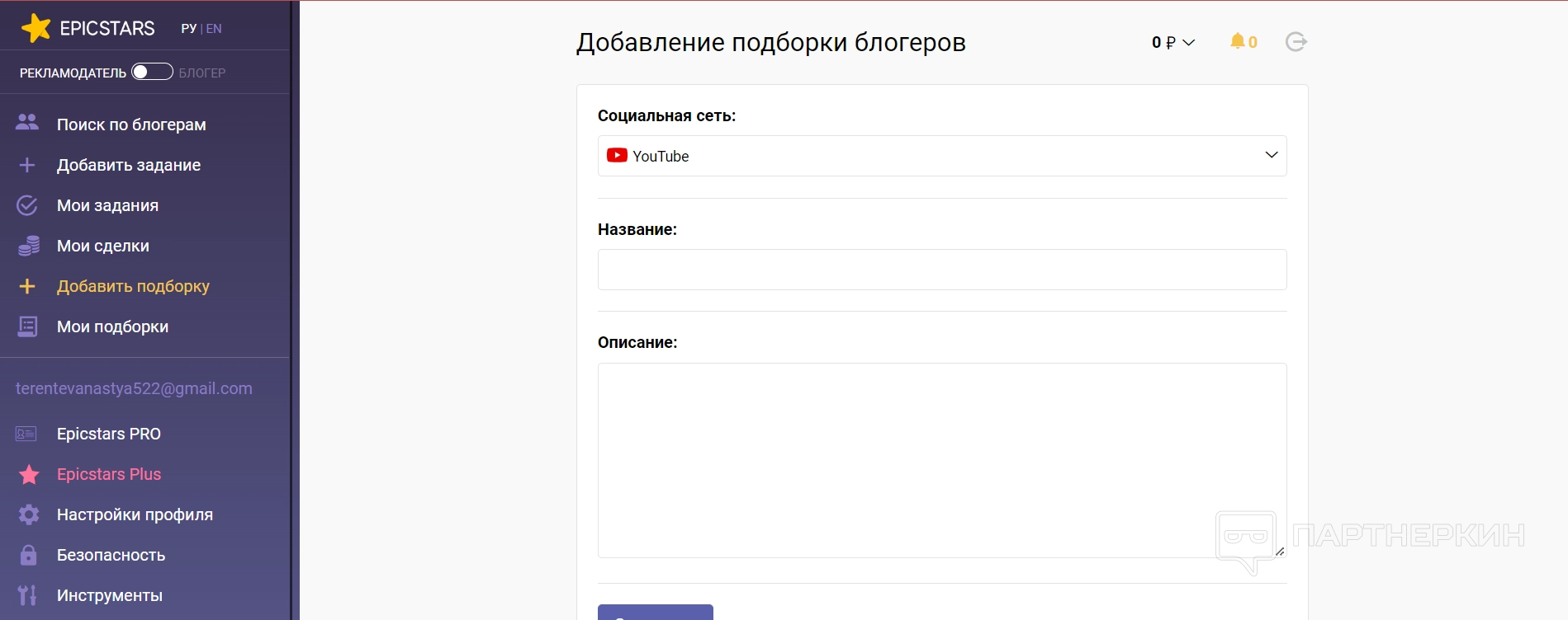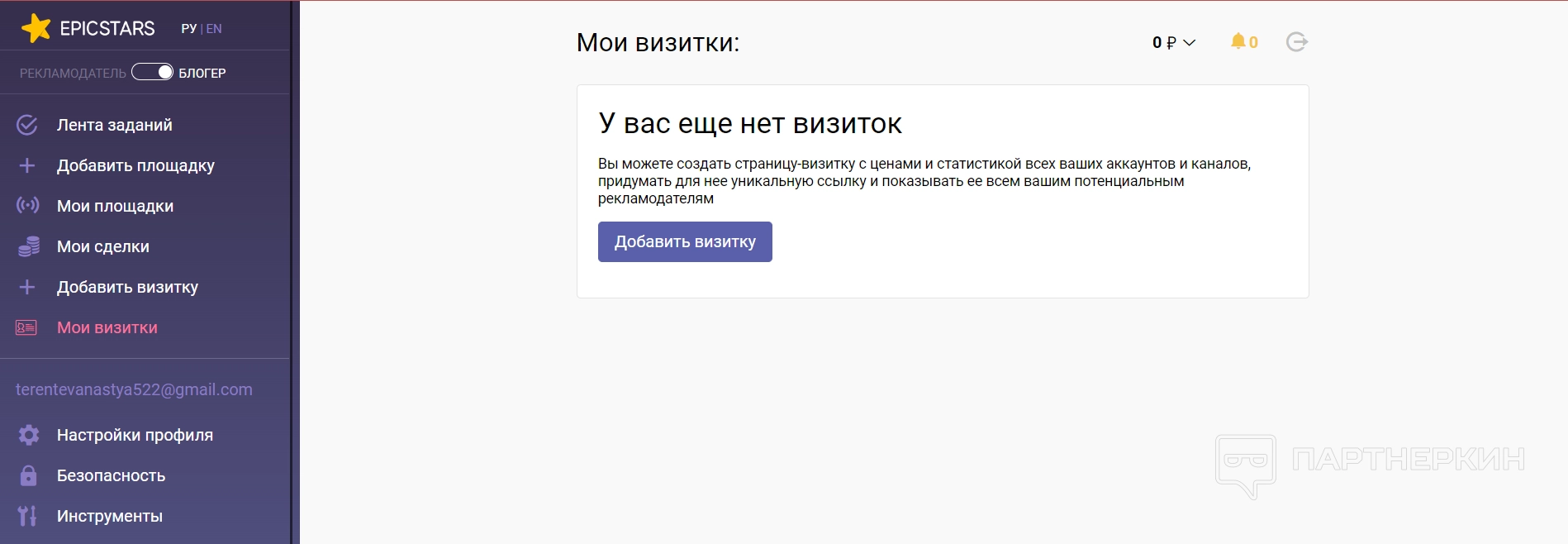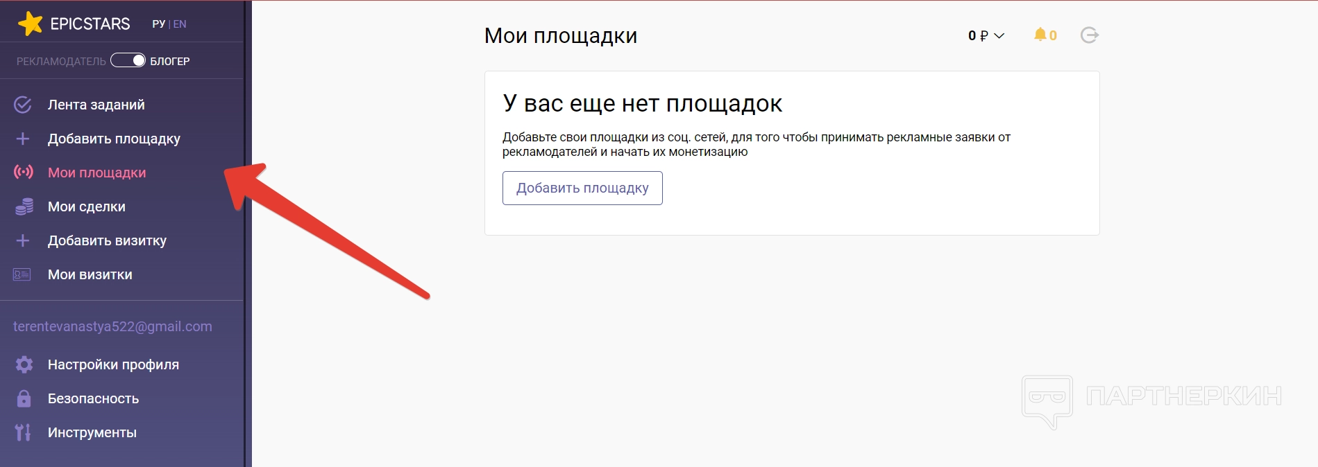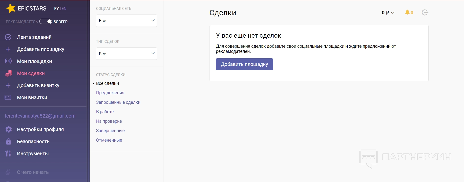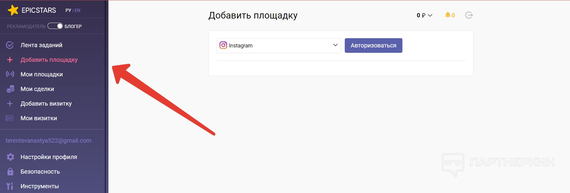 Добавить площадку — через этот раздел блогер может авторизоваться на определенной платформе. Например, войти в свои аккаунты в Инстаграм* или YouTube. Это необходимо, чтобы создавать свои визитки на платформе, а также брать определенное задание на выполнение.