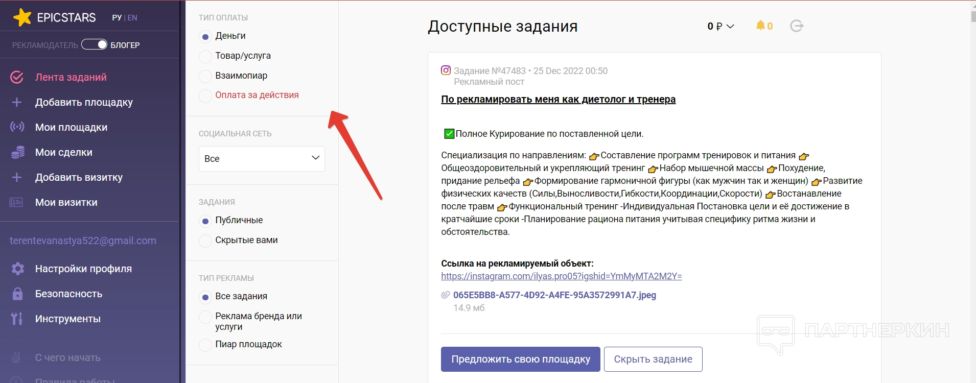 Лента заданий — в этом разделе блогеры могут искать задания, которые создают рекламодатели. Для каждого пользователя, вне зависимости от оплаты подписки на версию Pro, доступен фильтр по заданиям. В нем можно отметить способ оплаты за задание — например, деньги или товар, взаимопиар или оплата за действия подписчиков. Кроме того, по классике отмечается социальная сеть для рекламирования, вид задания и тип рекламы.
