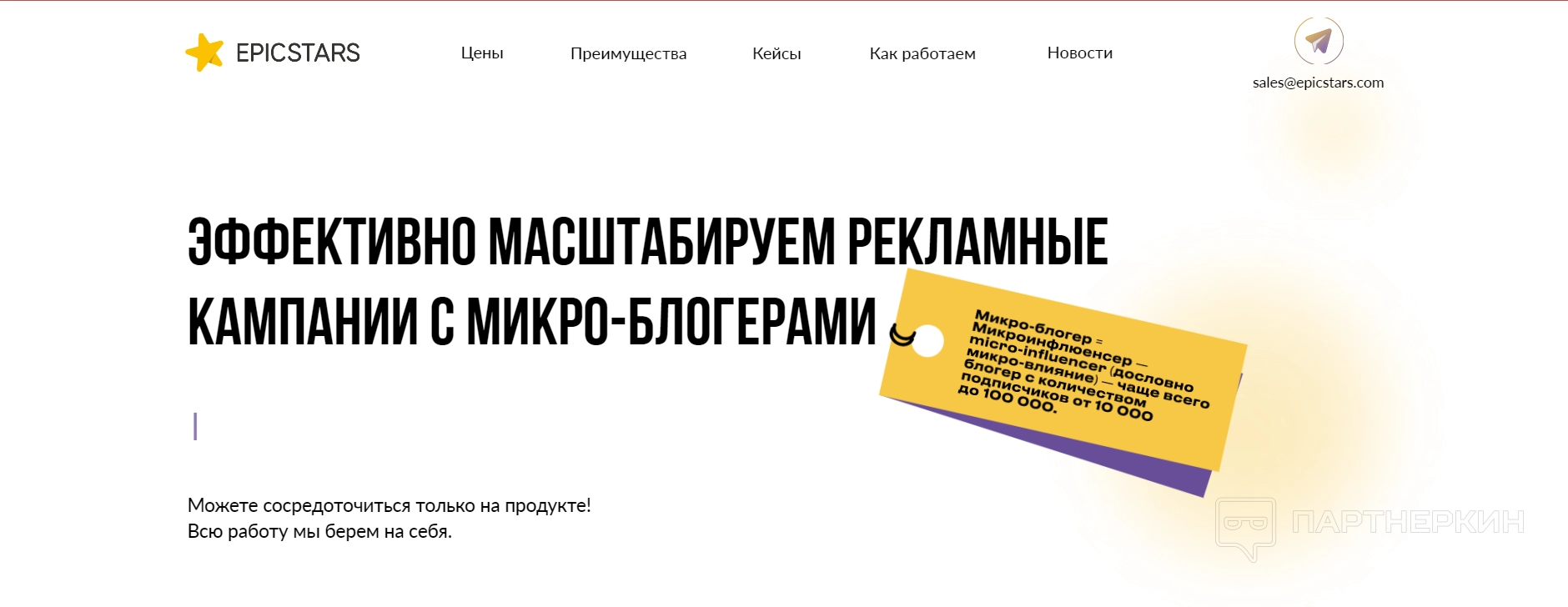 Пункт EpicStars Plus переводит на страницу, которая предлагает сотрудничество по системе B2B с сервисом. Это значит, что можно стать полноценным партнером и получать больше возможностей — за определенный вклад рекламодателю помогут не только подбирать блогеров под конкретные задачи, но и в целом развивать бизнес и бренд с помощью интернет-маркетинга.