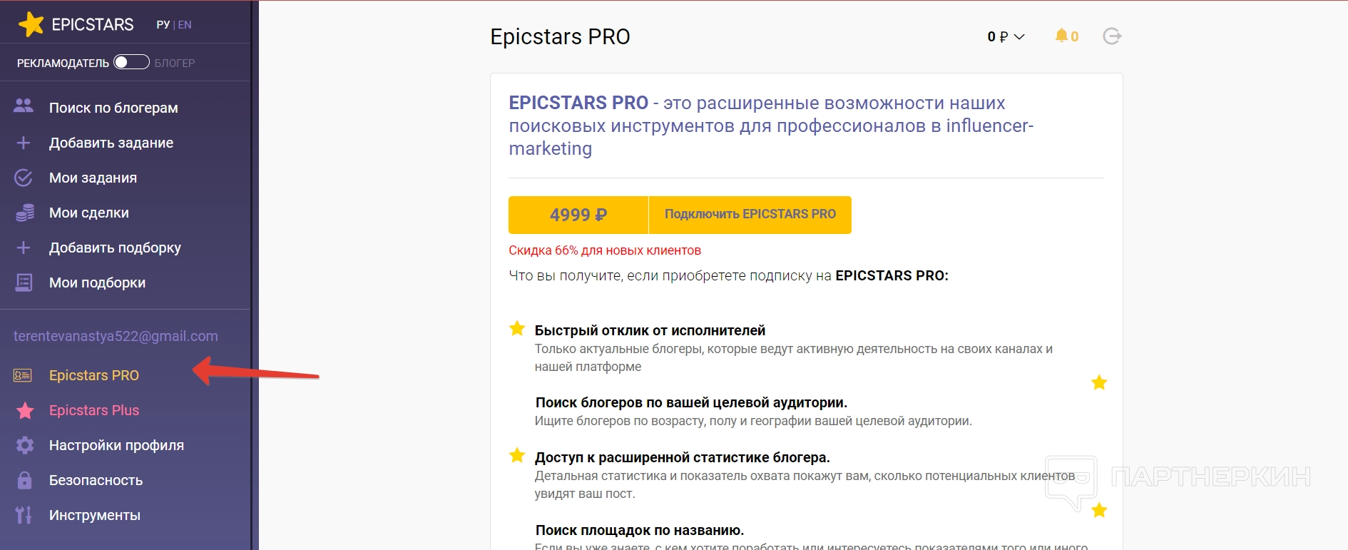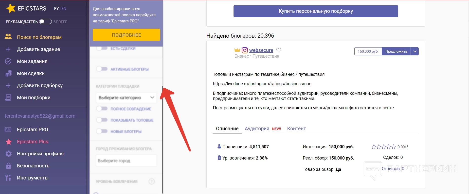В пункте EpicStars Pro можно оплатить подписку на сервис, которая дает больше возможностей для поиска и работы. Например, поиск блогеров по собственной целевой аудитории, просмотр расширенной статистики, фильтрация по наличию завершенных сделок и так далее.