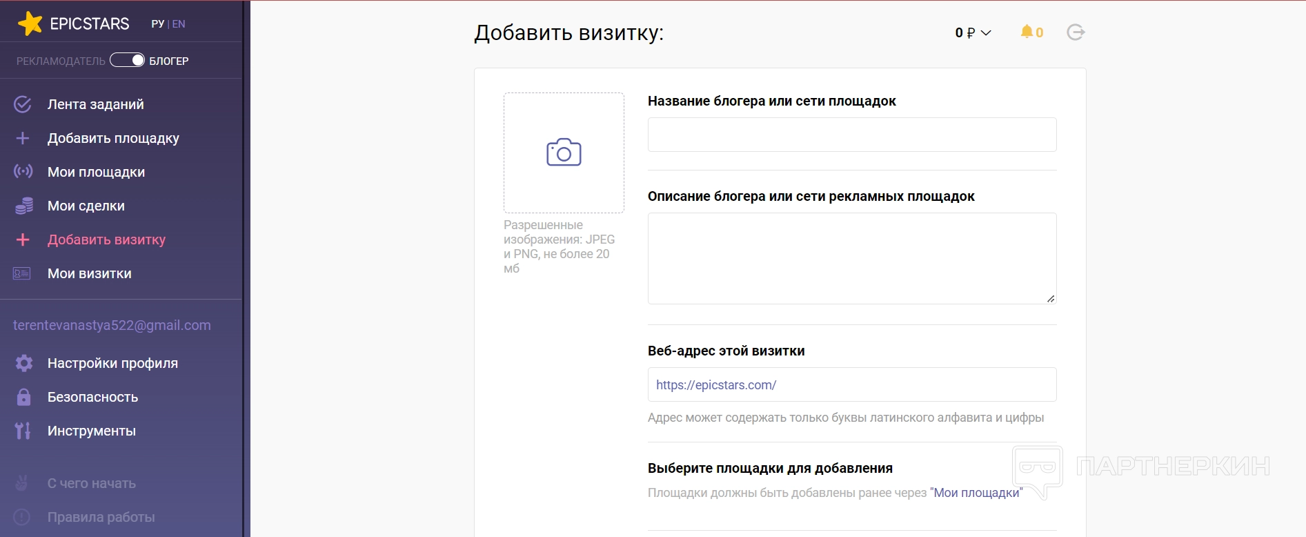 Добавить визитку — в этом разделе можно добавить собственную визитку на сайт, чтобы рекламодатели быстрее находили блогера. Для этого придется заполнить немного данных о себе и своей работе: название блогера, описание блогера или сети площадок, адрес визитки, площадки из списка «Моих площадок». Также можно прикрепить фотографию для повышения доверия.