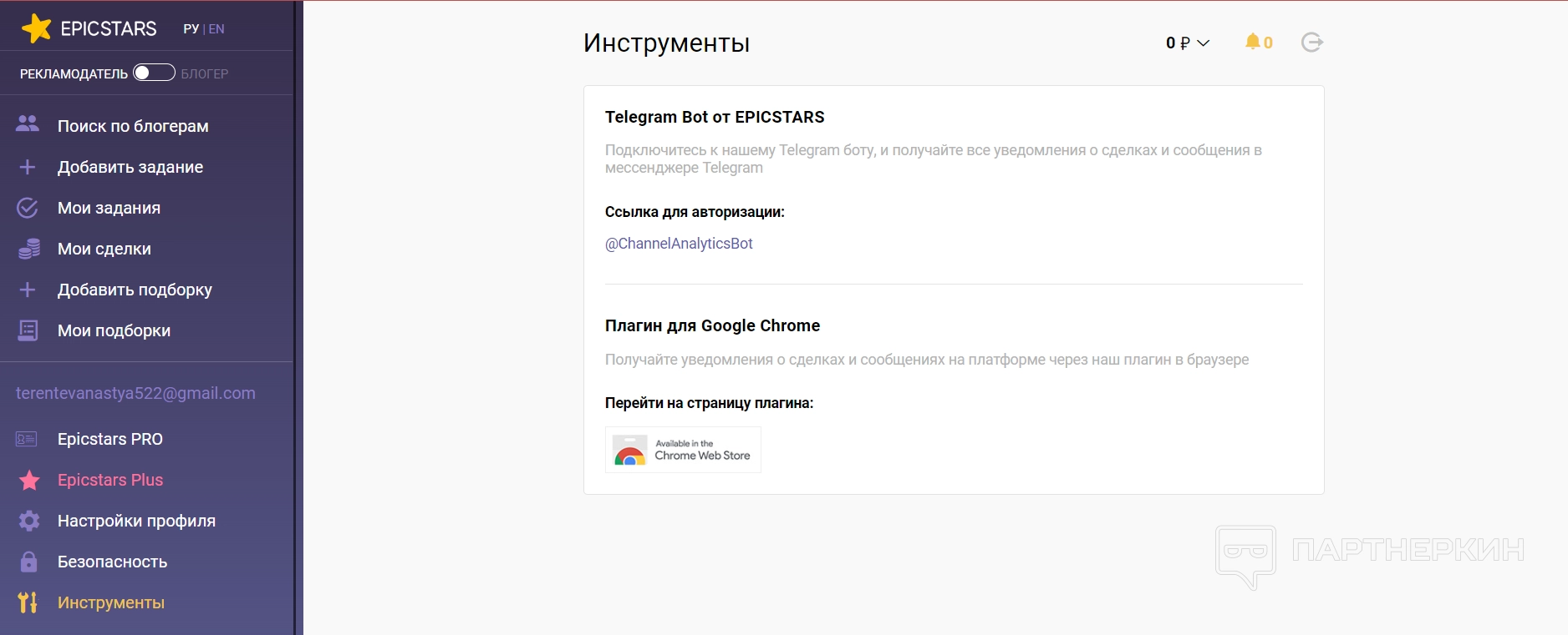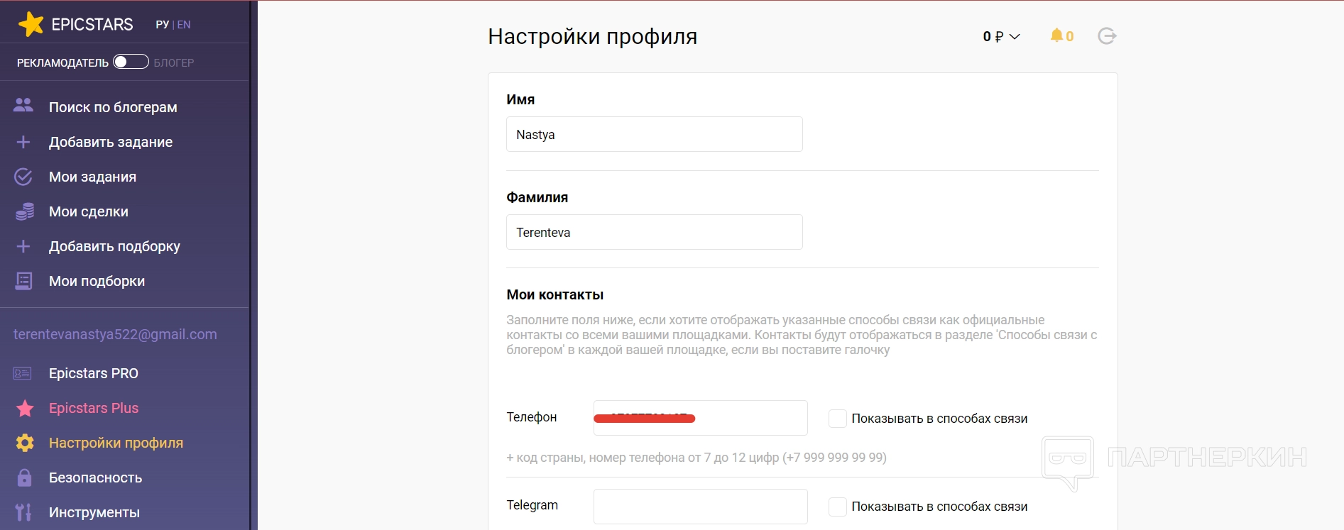 Дополнительные настройки одинаковы для обоих кабинетов — и рекламодателя, и блогера. Но есть два пункта, которые появляются только в кабинете рекламодателя — это EpicStars Pro и EpicStars Plus.