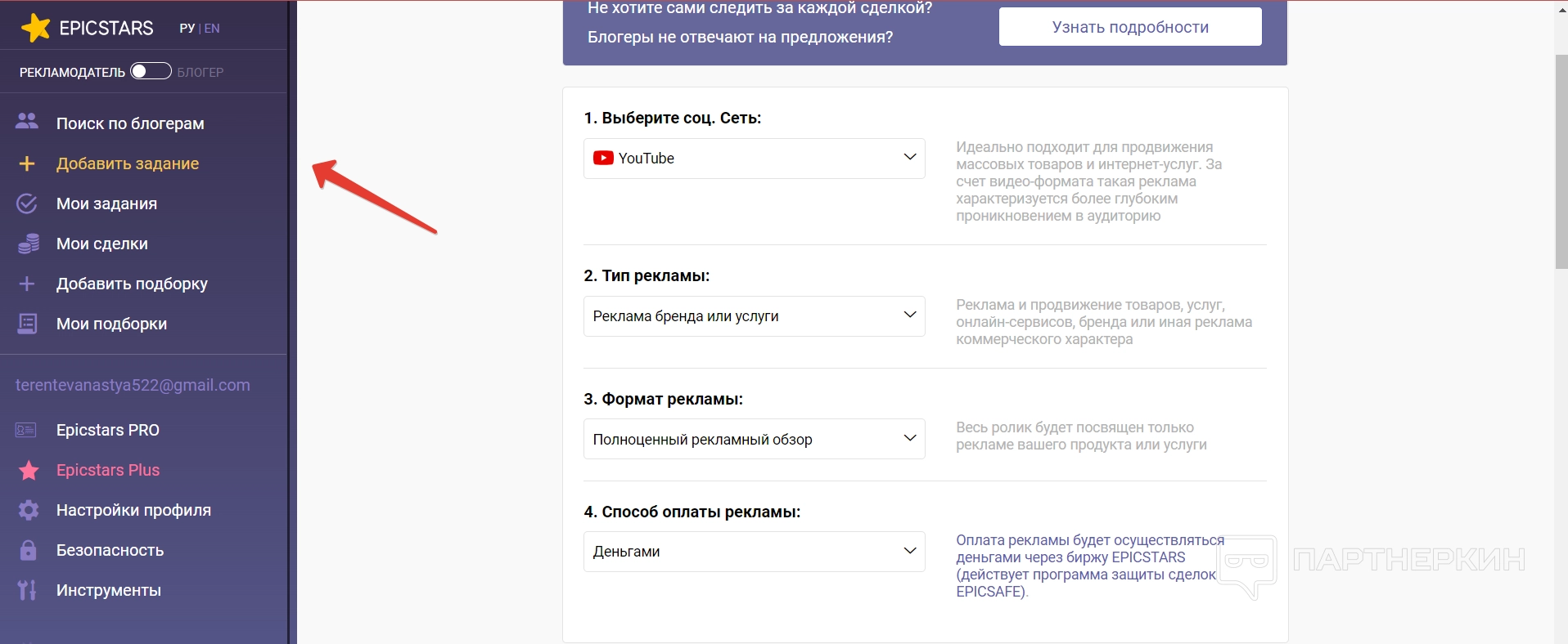Добавить задание — в этом разделе можно добавить задание, чтобы сами блогеры откликались на него. Для создания придется обозначить платформу для рекламы, тип рекламы, формат, а также способ оплаты. Можно ввести и дополнительные данные: описание задания, подробное описание, категория, ссылка на страницу и материалы для рекламы, например, техническое задание.