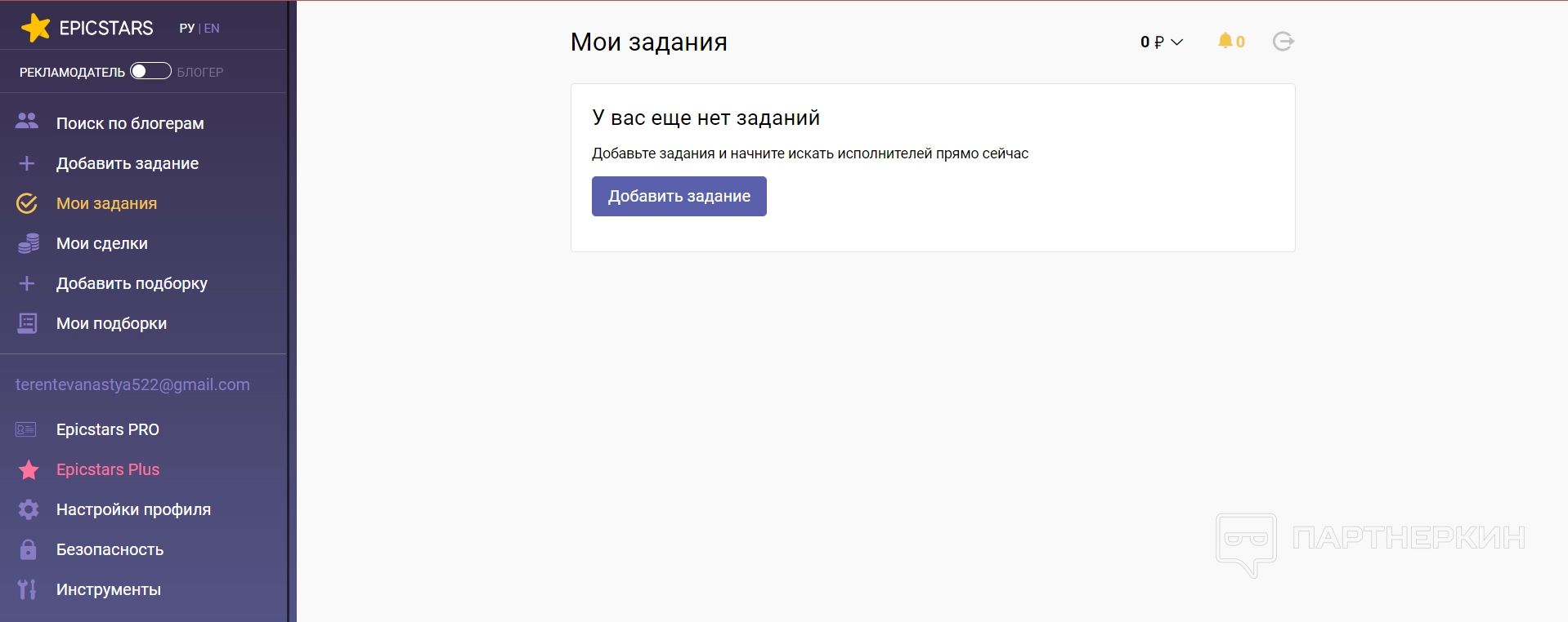 Мои задания — в этом разделе показывают все задания, которые создавал рекламодатель. Если их нет, то будет показываться кнопка добавления нового задания.