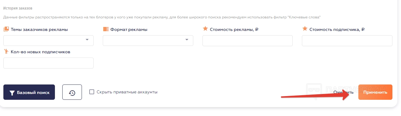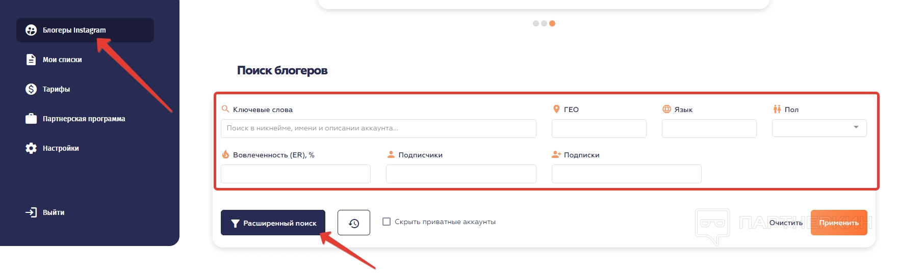 Сразу после регистрации вебмастер попадет в раздел «Блогеры Instagram*», в котором осуществляется поиск и выбор экспертов. Для поиска можно указать следующие параметры: