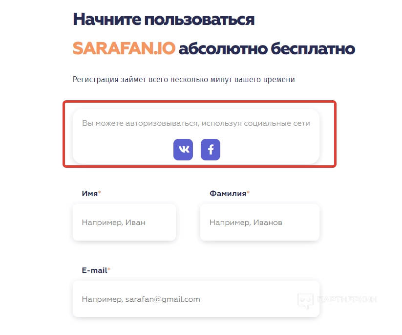 В процессе потребуется указать имя, фамилию, электронную почту и пароль. Также можно пройти регистрацию, авторизовавшись через свои странички в Вконтакте или Facebook*.