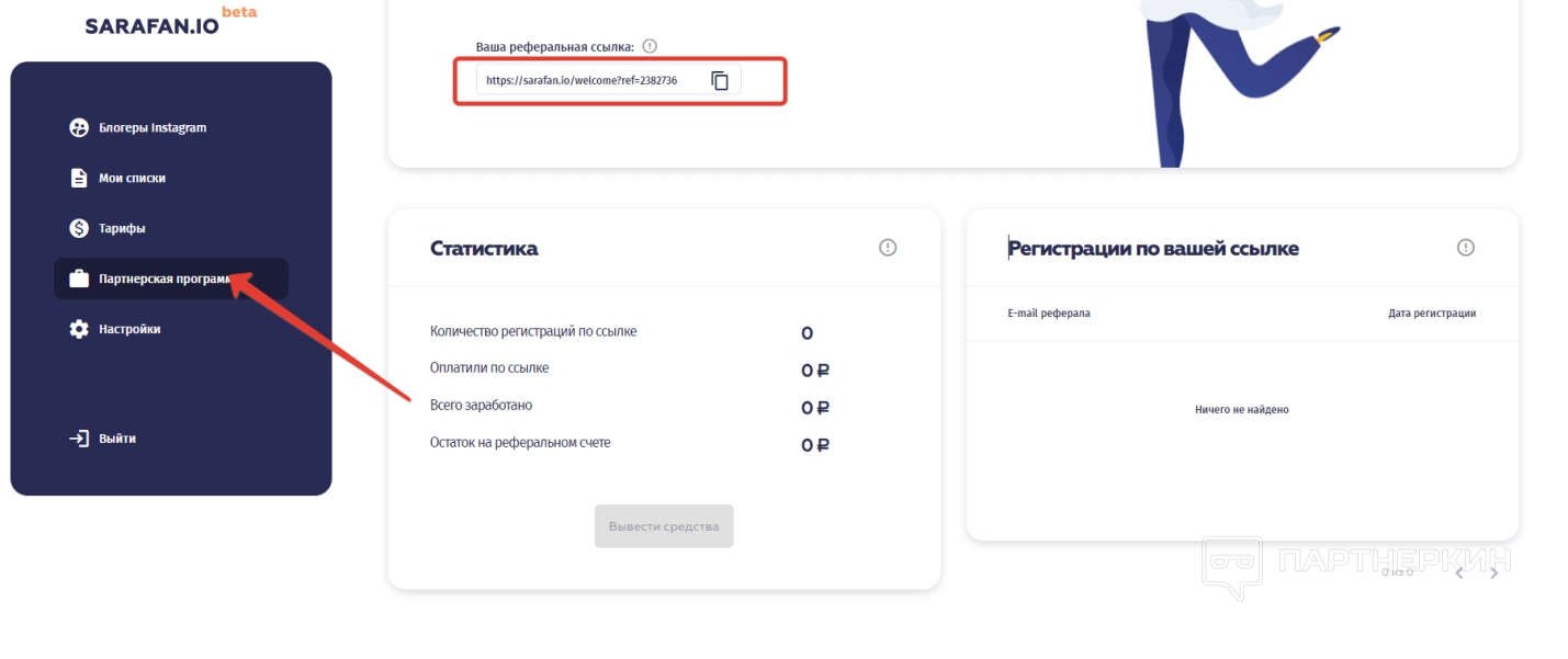 Также стоит обратить внимание на раздел «Партнерская программа», где можно найти реферальную ссылку и ознакомиться со статистикой по привлеченным пользователям.