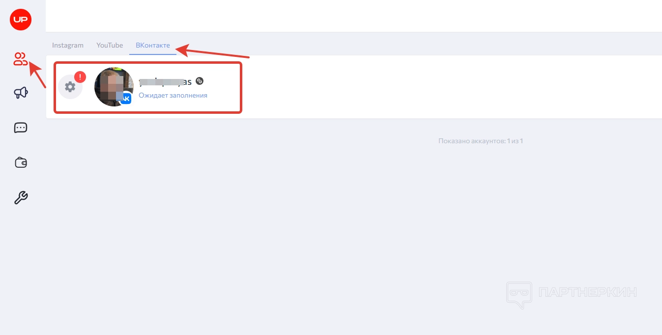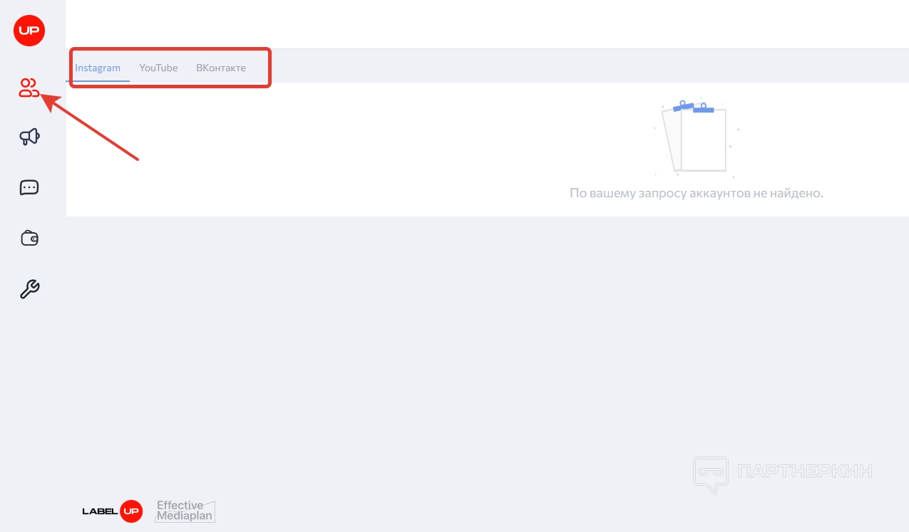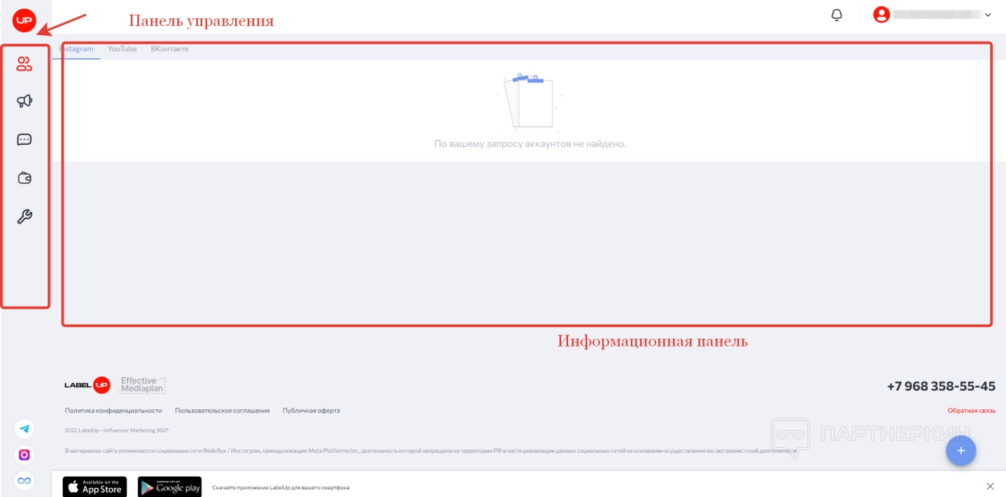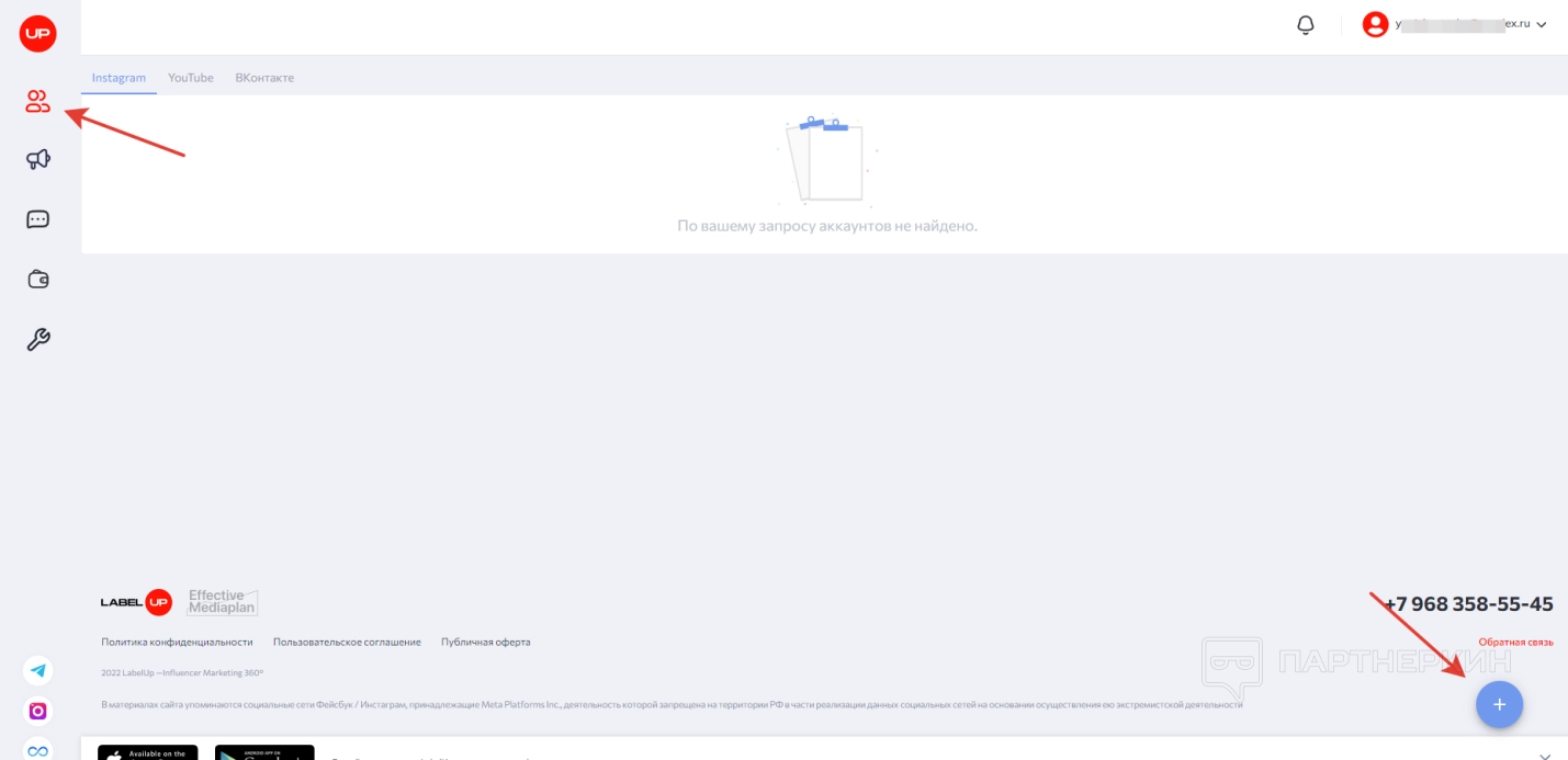 На панели управления есть 5 разделов. Первый из них — «Аккаунты». С его помощью пользователь может размещать в сервис аккаунты, которые будут выступать в качестве площадок для продажи рекламных мест. На момент написания статьи платформа принимала странички из Instagram*, YouTube и Вконтакте.