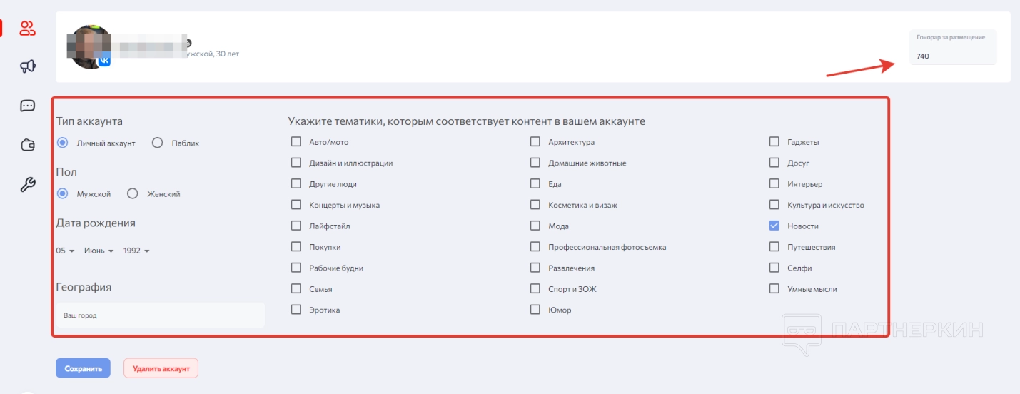 Чтобы настроить профиль, кликаем на шестеренку. Там нужно выбрать тип аккаунта, пол, ГЕО, тематику и стоимость размещения.