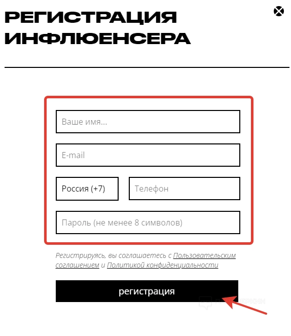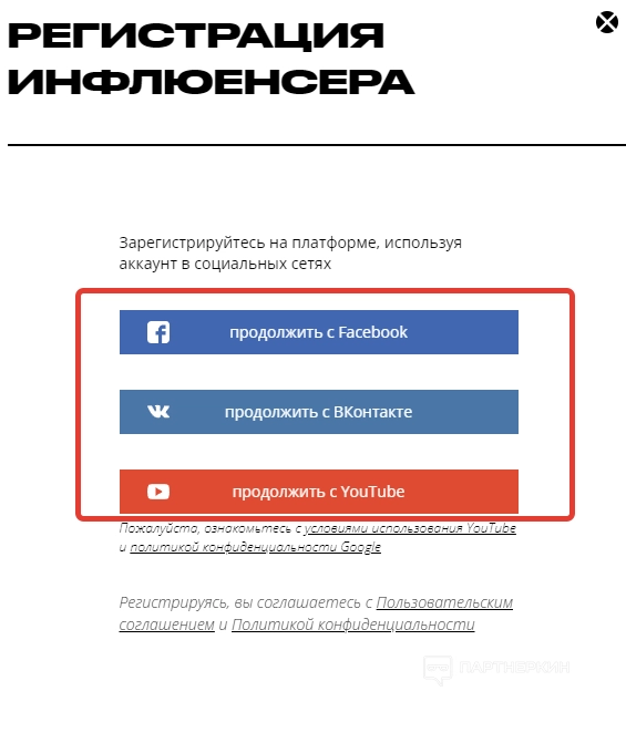 Выбираем, например, «Инфлюенсер» и создаем аккаунт. Система предложит пройти регистрацию, используя аккаунты от Facebook*, Вконтакте или YouTube.