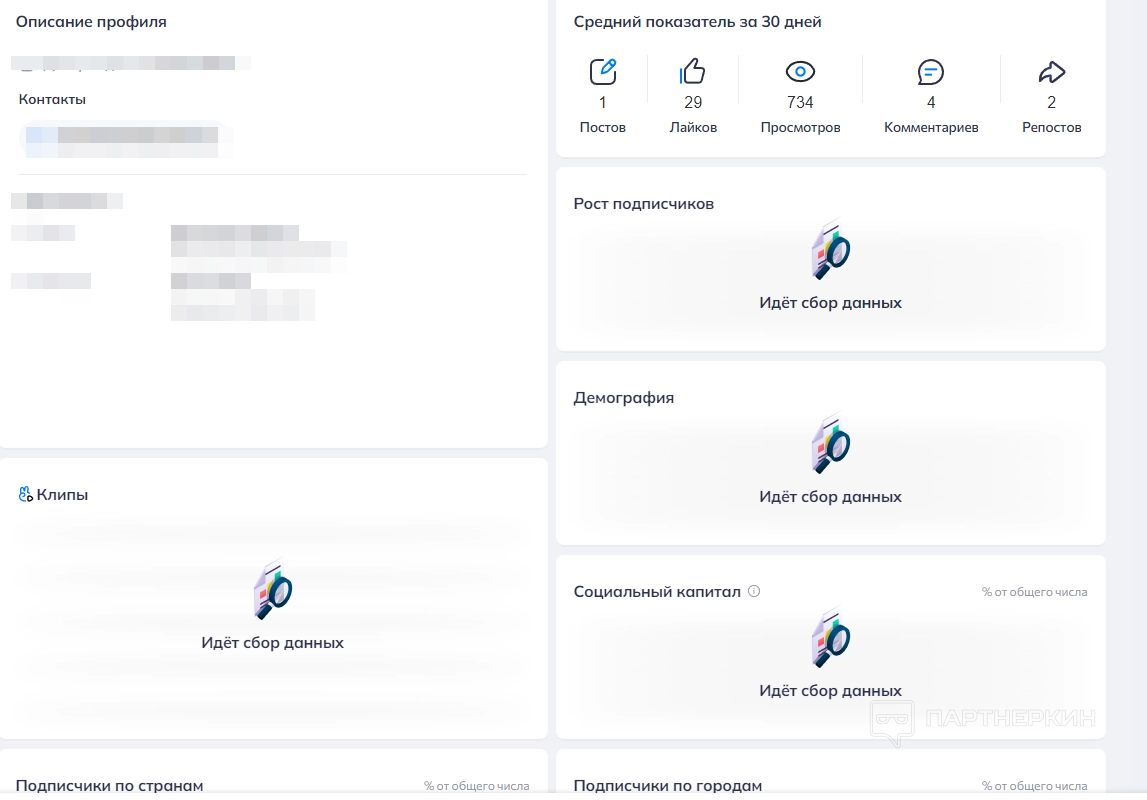 - средний показатель за последний месяц (кол-во постов и лайков, просмотры, комментарии, репосты;