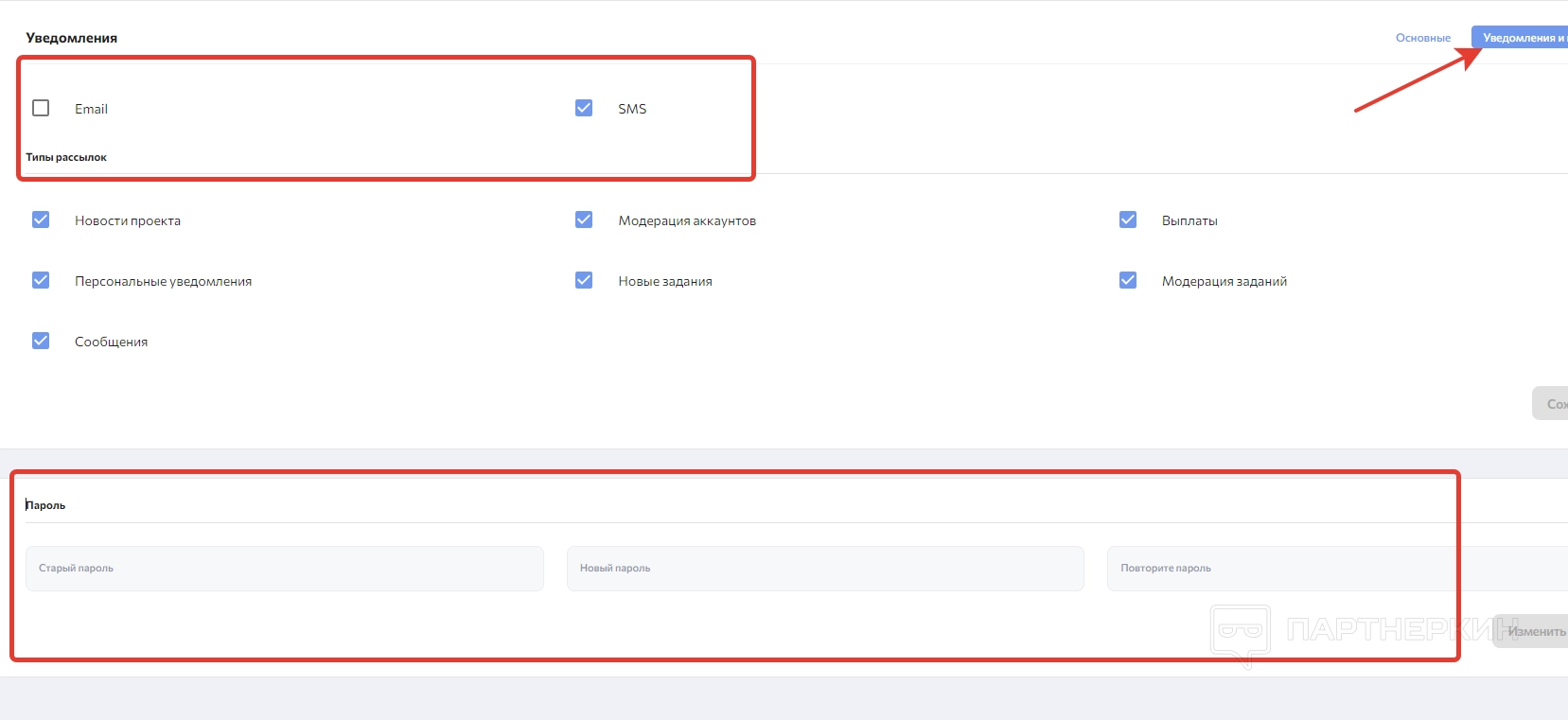 Если же перейти во вкладку «Уведомления», расположенную в правом верхнем углу, пользователь попадет в раздел, где можно настроить рассылку или изменить пароль.