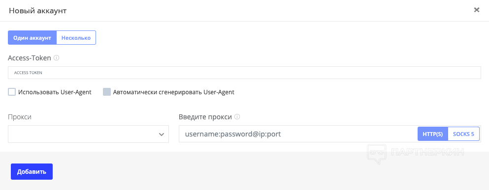 Подключать можно как по 1 аккаунту, так и пачкой. Для этого сверху нужно выбрать соответствующую вкладку. Для коннекта понадобится access token. Для его получения переходим в код страницы Ads Manager и делаем поиск по фразе accessToken=". Куча символов после кавычек — и есть токен доступа. Также нужно указать данные от прокси, того же, через который заходите в профиль в антидетекте. Опционально можно указать User-Agent.