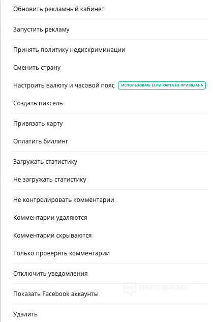 На вкладке «Кабинеты» выводятся все кабы, привязанные к добавленным соцам. Здесь доступных действий еще больше. Мы можем создавать пиксель, выполнять простые действия с комментариями, запускать рекламу и еще много чего: