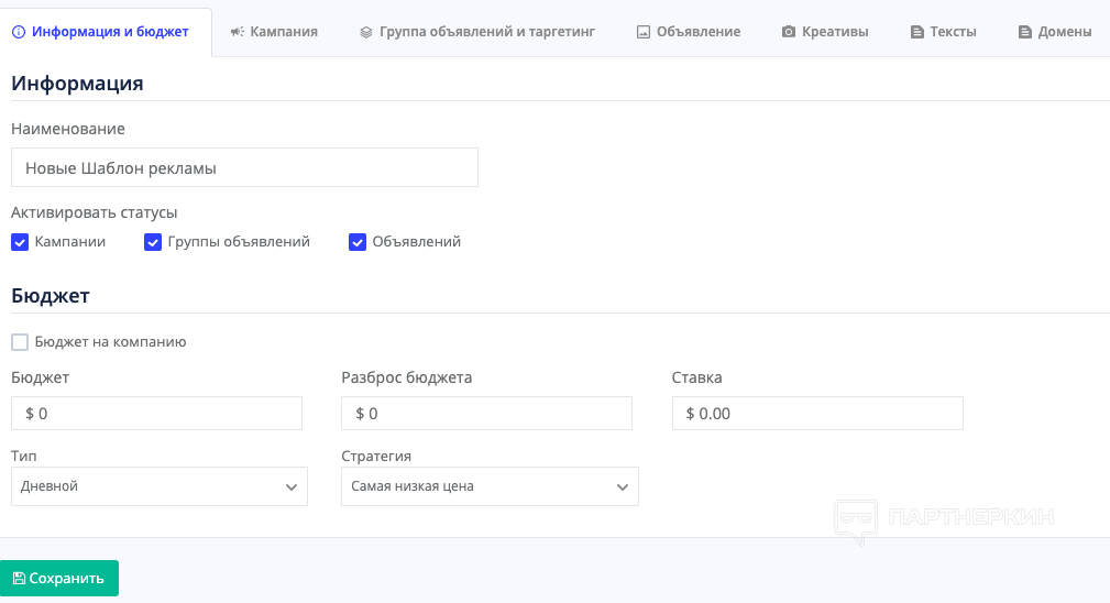 Для начала называем шаблон и указываем бюджеты:
