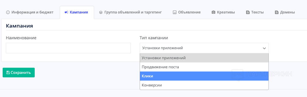 Теперь название кампании и цель. Доступны 4 цели, самые популярные среди арбитражников: