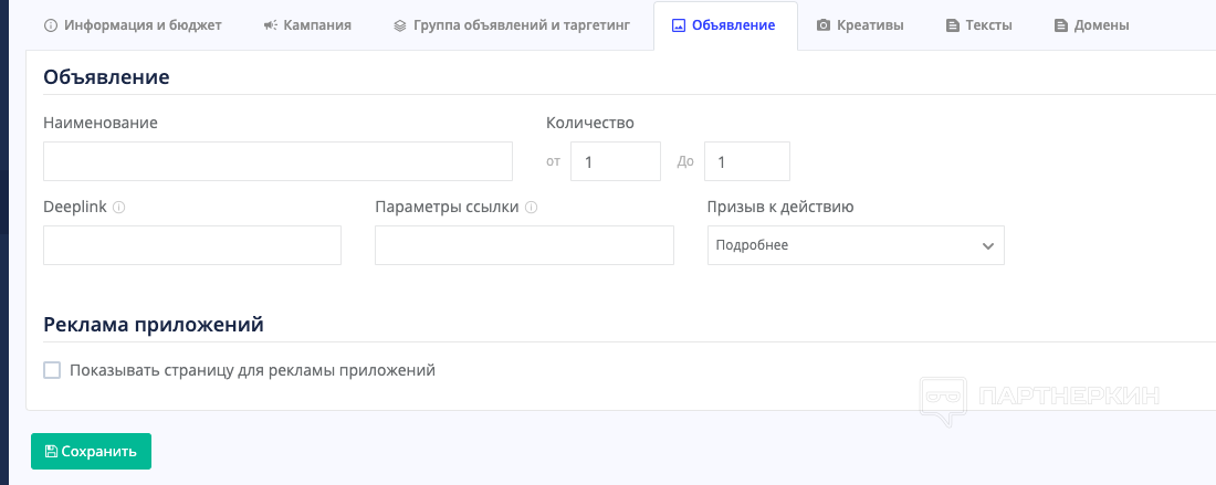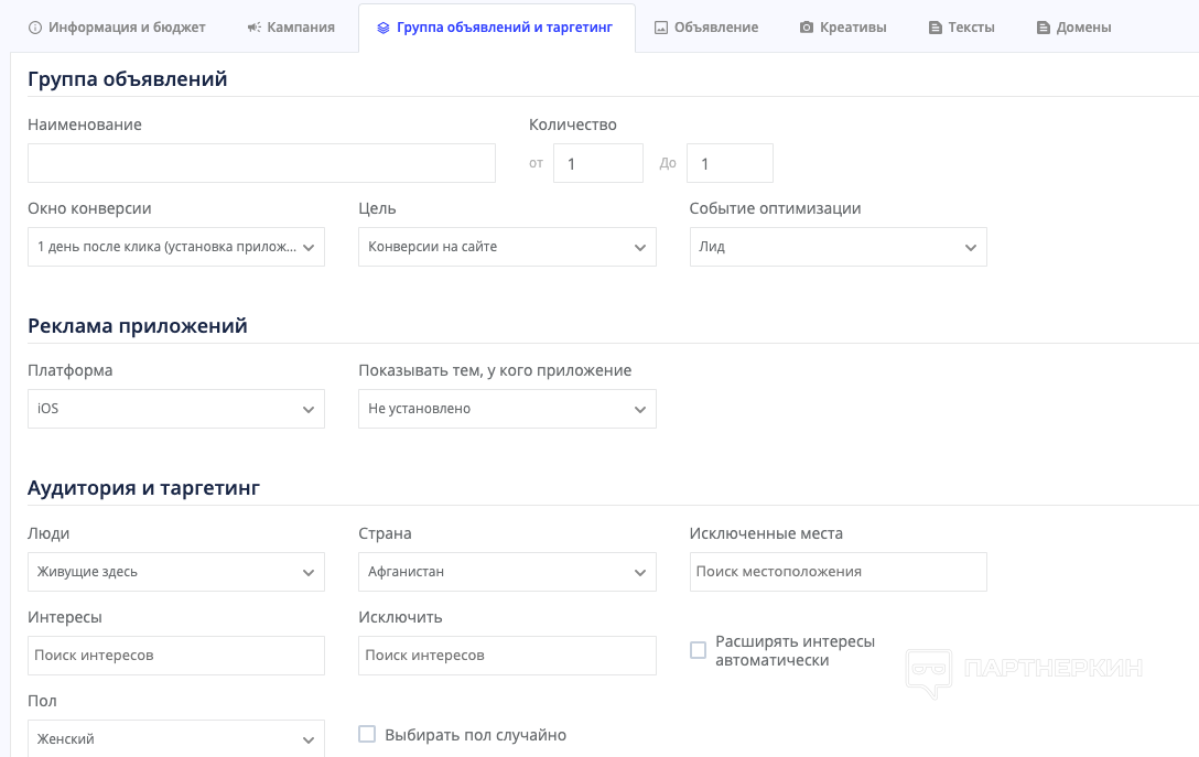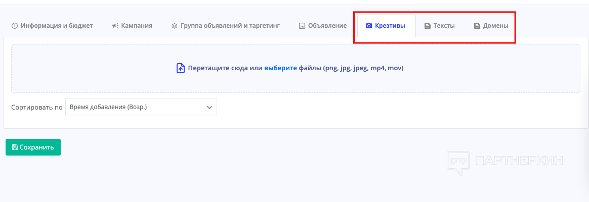 Креативы, тексты и домены загружаются в следующих вкладках: