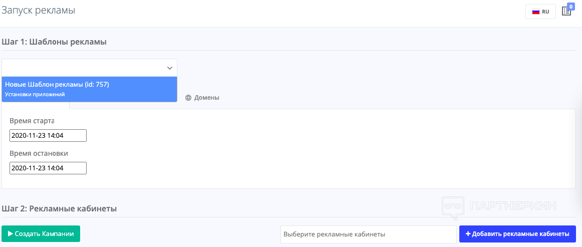 Создание шаблона рекламы и запуск кампании