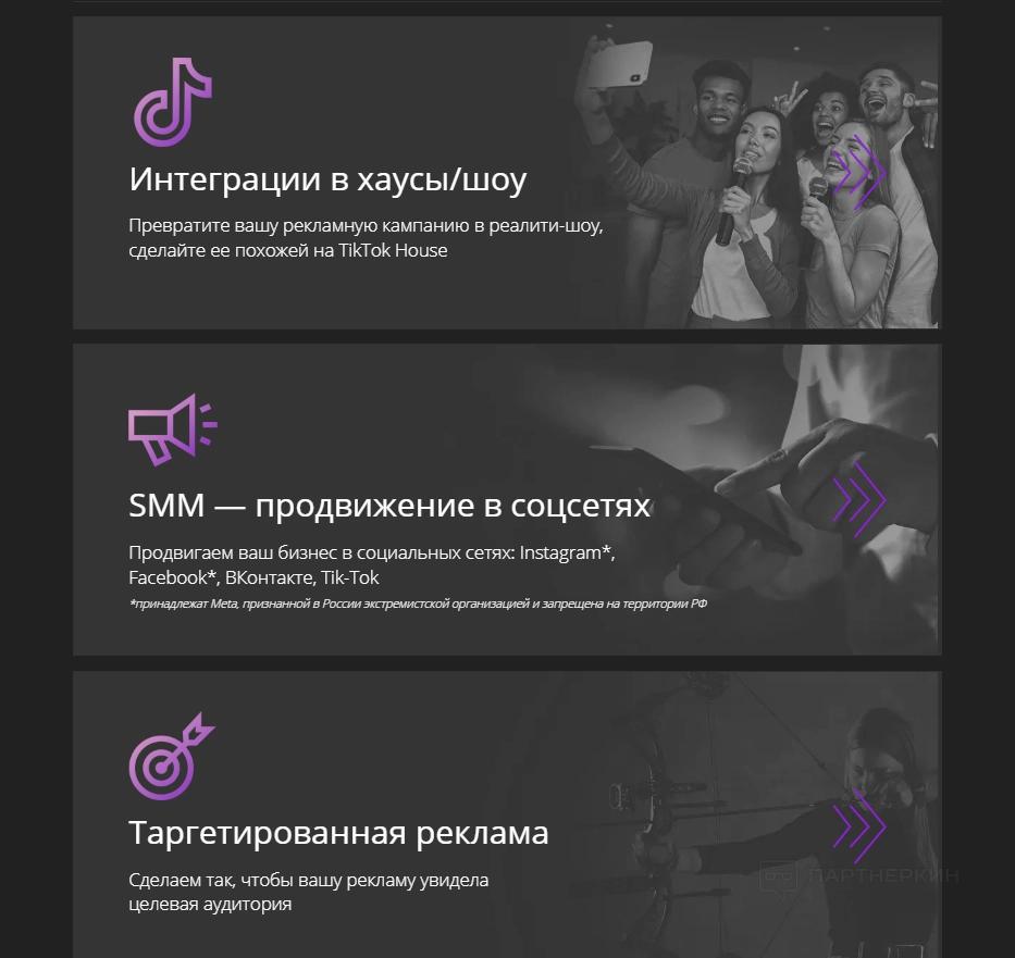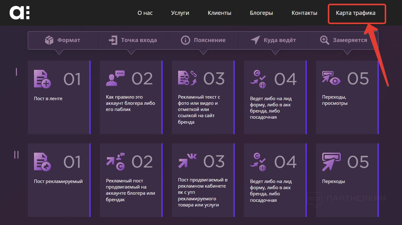 Стоит учесть, что агентство работает с такими площадками, как Вконтакте, TikTok, Telegram, Instagram* и YouTube. Для каждой социальной сети на сайте представлена карта трафика, которая поможет понять, как будет осуществляться продвижение продукта. Найти ее можно в соответствующем разделе.