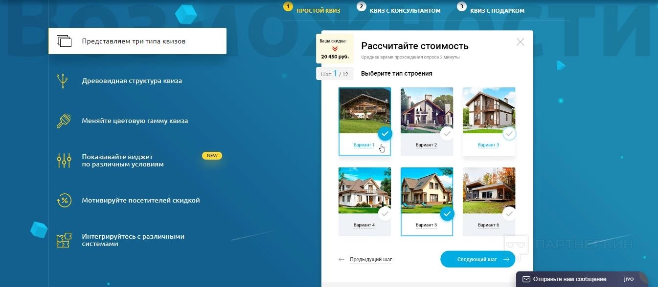 • Квиз с консультантом . Маркетинговый опрос, уточняющий вопросы относительно покупки. Есть возможность подключить скидку за прохождение теста. Повышает вероятность приобретения товара.