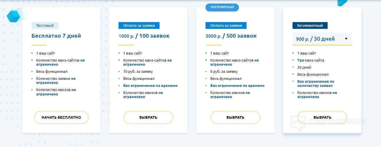 могут оплачивать функционал сервиса несколькими способами: покупать пакеты заявок или приобрести безлимитный тариф. Во всех вариантах предоставляется полный безлимит по функционалу, количеству квизов и длительности жизни опроса.