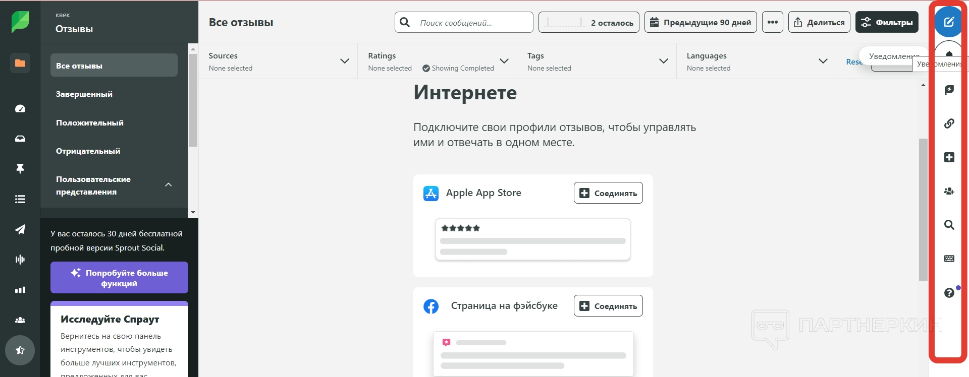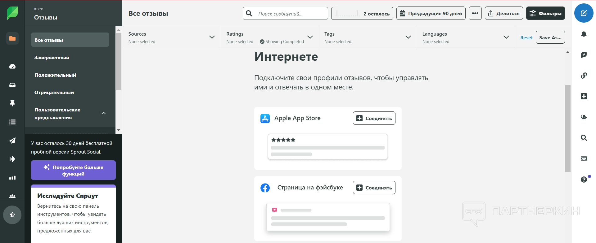 Отзывы — данный раздел собирает отзывы пользователей со всех подключенных площадок. Список включает AppStore,страницу на Фейсбуке*, Google Бизнес и прочие. Достаточно подключить указанные платформы, и вс еоставленные пользователями отзывы впоследствии будут показываться на сервисе. Это помогает следить за репутацией бренда эффективнее.
