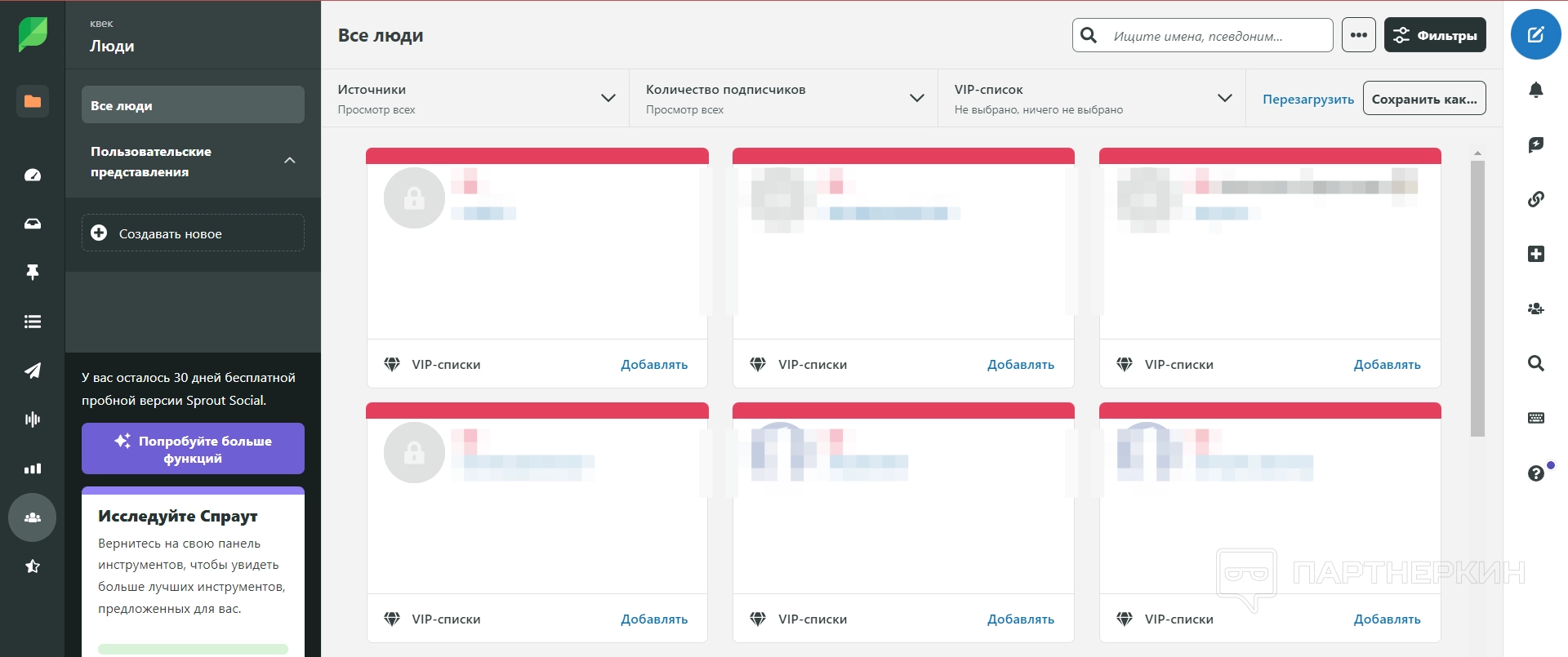 По умолчанию показываются абсолютно все пользователи из разных источников, то есть изо всех указанных социальных сетей. Для сегментации можно через поле слева создать новый список и перебрасывать в него нужных людей.