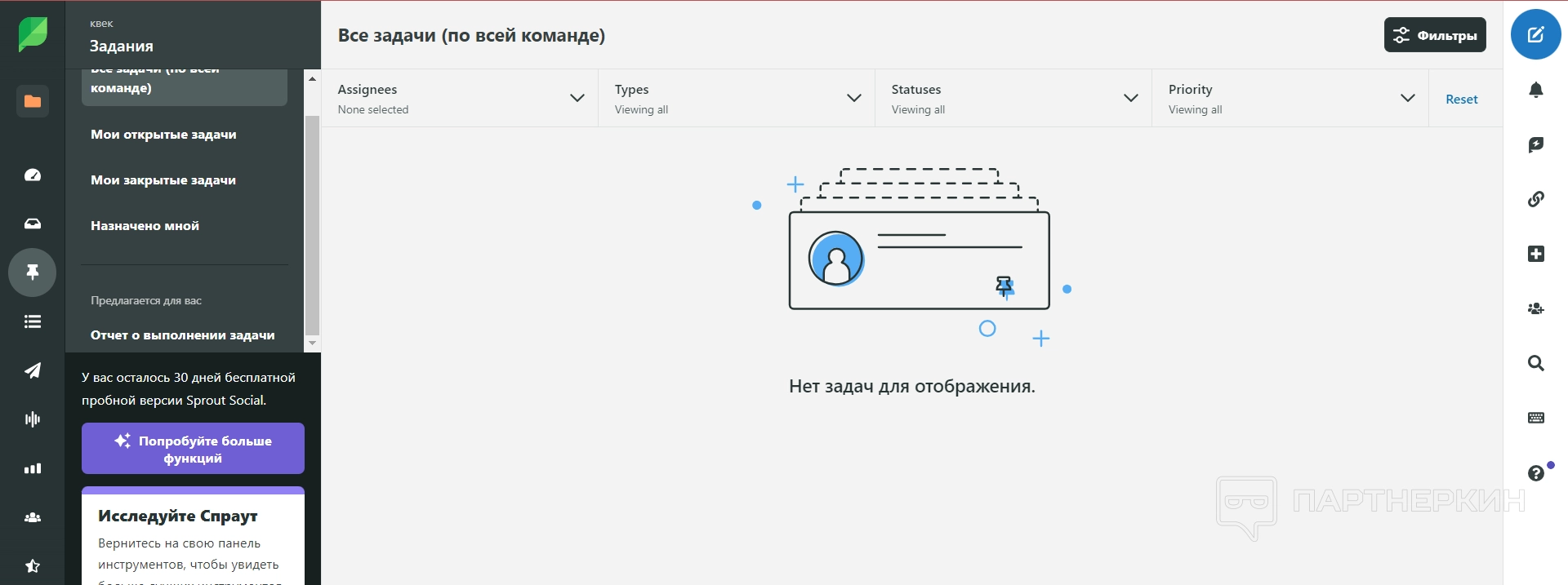 Задания — в этом разделе можно просматривать список задач, которые создал пользователь на сервисе. Задачи могут создавать и другие члены команды — это помогает контролировать процесс работы, ведь они будут отображаться на главной странице, и каждый сможет их видеть и не забывать выполнять.