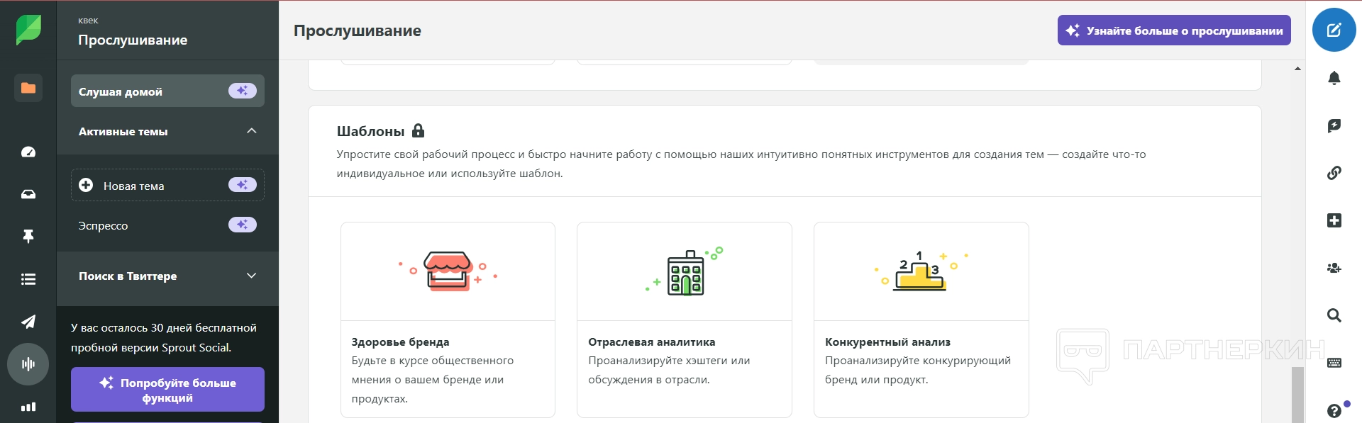 Прослушивание — этот раздел направлен на улучшение взаимодействия с аудиторией. Его стоимость не входит в тарифный план, поэтому запрашивать услугу придется дополнительно. С ее помощью можно будет узнать мнение аудитории о бренде, проанализировать производительность бренда в конкретной отрасли, а также провести сравнительный анализ конкурентов и отслеживать реакцию подписчиков на события и мероприятия. Для каждой задачи есть отдельный инструмент.