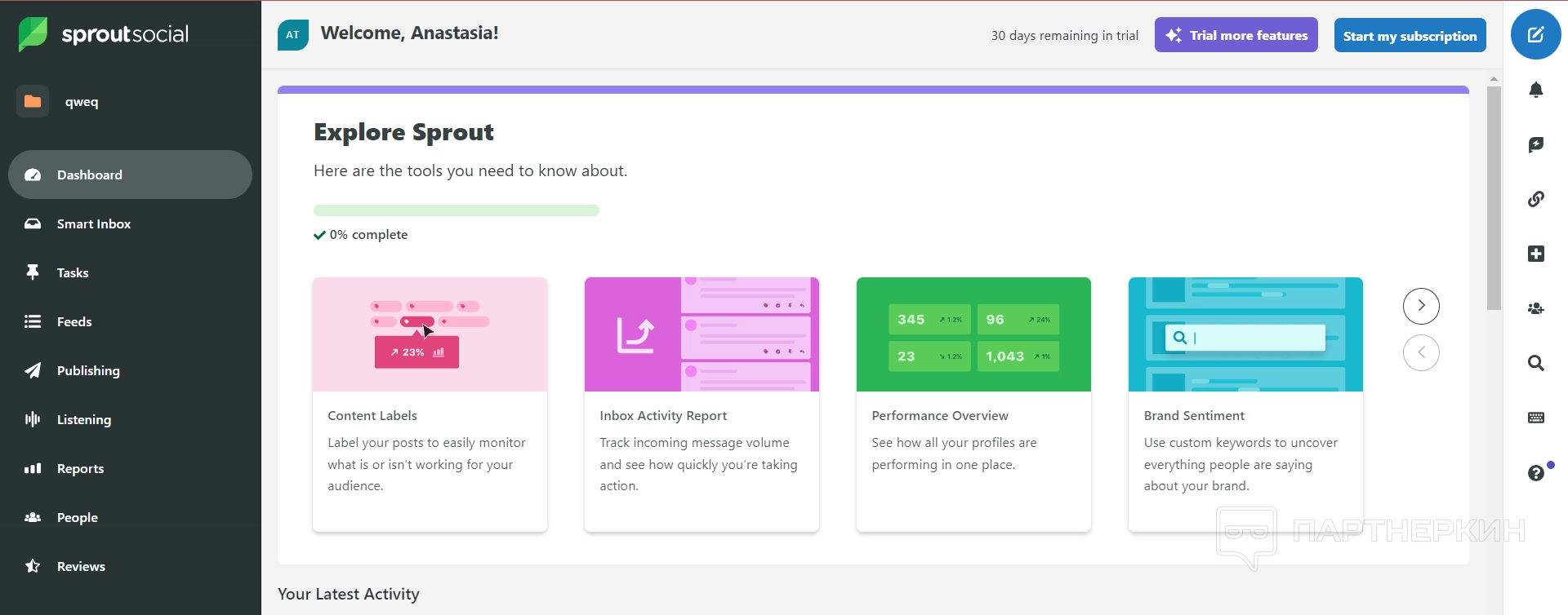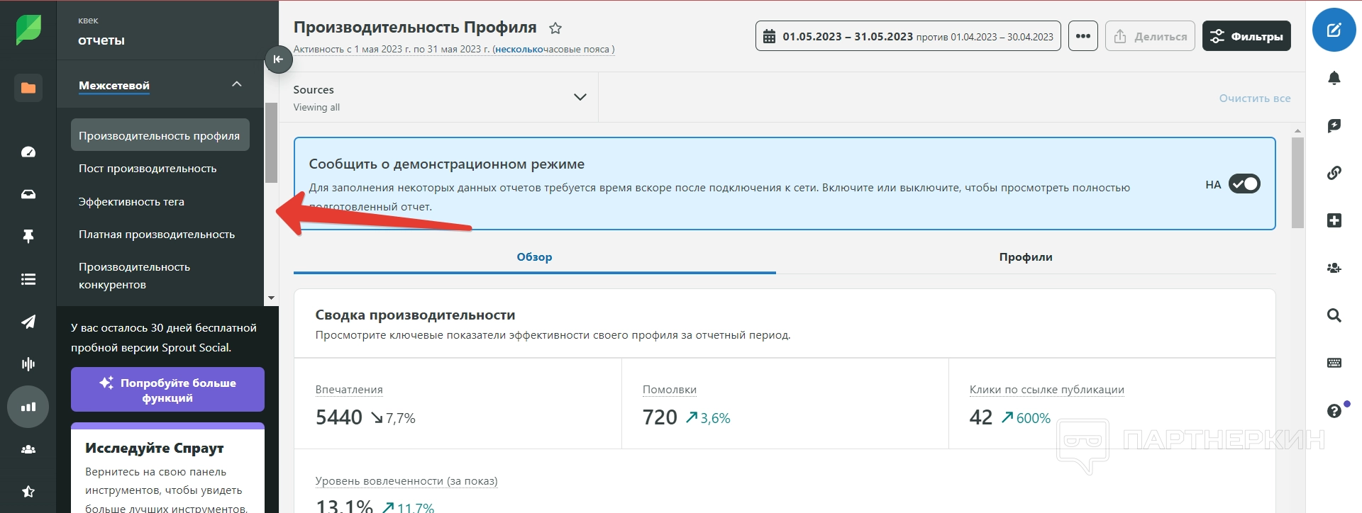 Помимо этого, вверху перечисляют все основные инструменты сервиса, которые можно изучить — отчеты активности, обзор производительности, подключение большего числа профилей и так далее. С этого раздела можно легко переходить на страницу с нужным инструментом из списка, чтобы не искать его долго.