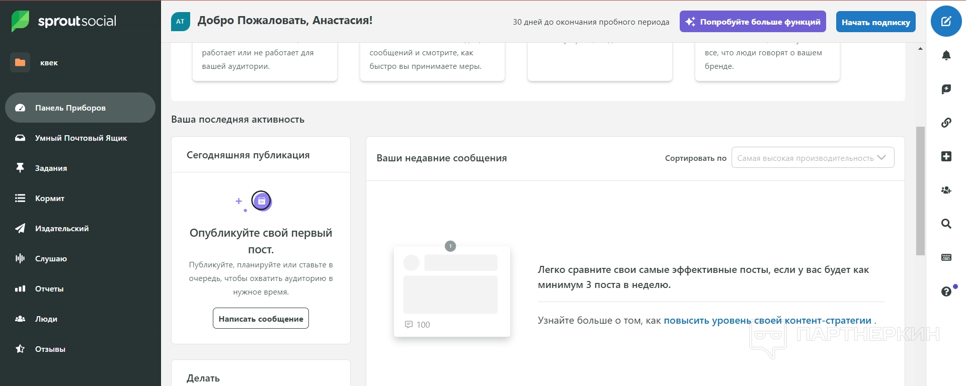 Дашборд — данный раздел включает информацию о последней активности пользователя. Например, можно посмотреть последние публикации в соцсети, по которым будет приводится статистика. С этого же раздела можно создать новую публикацию по желанию.