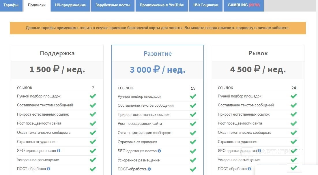 - Gambling. Продвижение 25 гемблинг-ссылок и офферов. Тариф «Рунет» стоит 7 199₽, «Бурж» – 299$. Можно оплатить поддержку проекта (15 дополнительных ссылок): по русскому Интернету это будет стоить 3 500 рублей в неделю, по иностранному – 155$ в неделю.