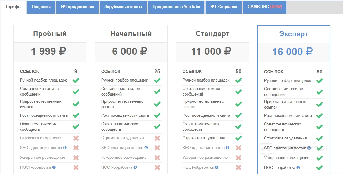 - Эксперт, 16 000 ₽. 80 ссылок все функции «Стандарта», а также SEO-адаптация постов, ускоренное размещение и ПОСТ-обработка (отслеживание и реагирование).