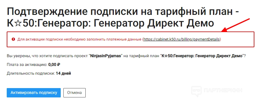 Для активации подписки нужно заполнить платежные данные. Пользователю необходимо перейти по ссылке.