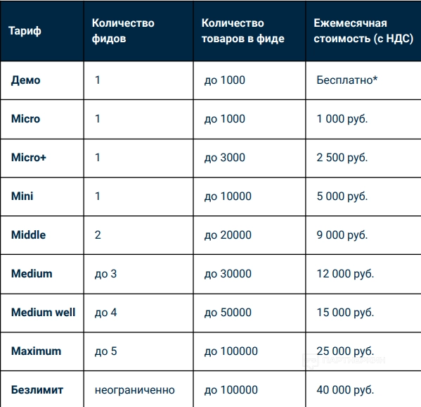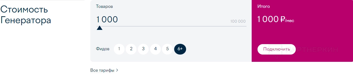 Стоимость Генератора. Зависит от количества товаров в фиде (от 1 000 до 100 000) и размера фида (от 1 до 6+).