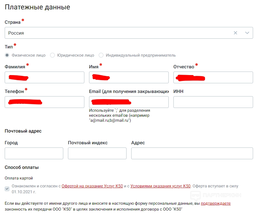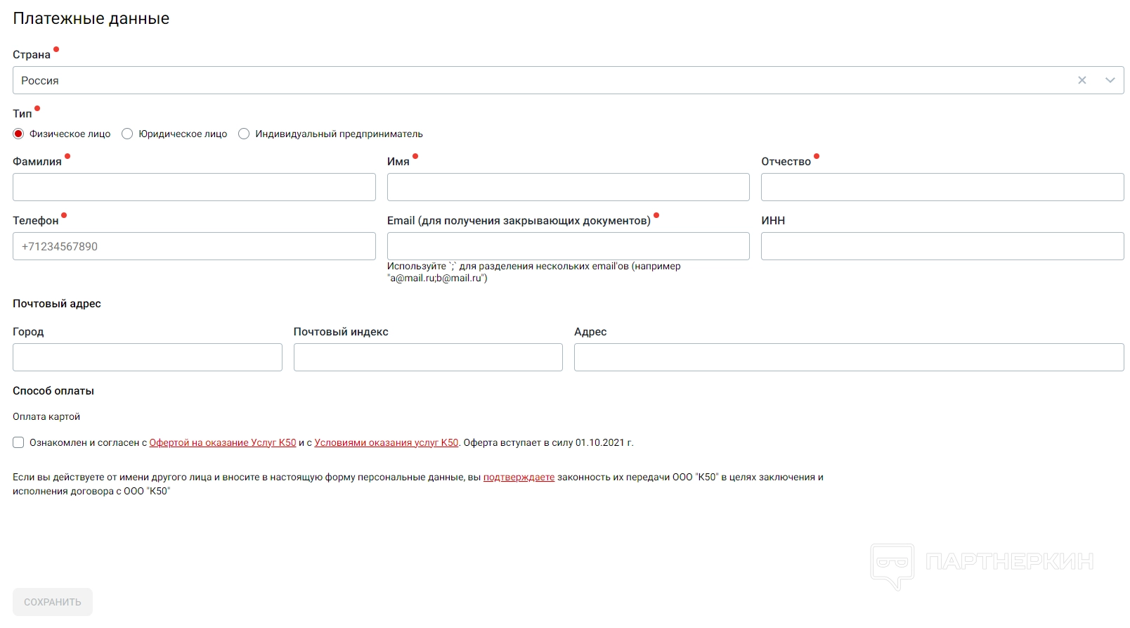 После заполнения обязательных полей (помечены звездочкой) необходимо ознакомиться и согласиться с офертой на оказание услуг K50 и нажать кнопку «Сохранить».