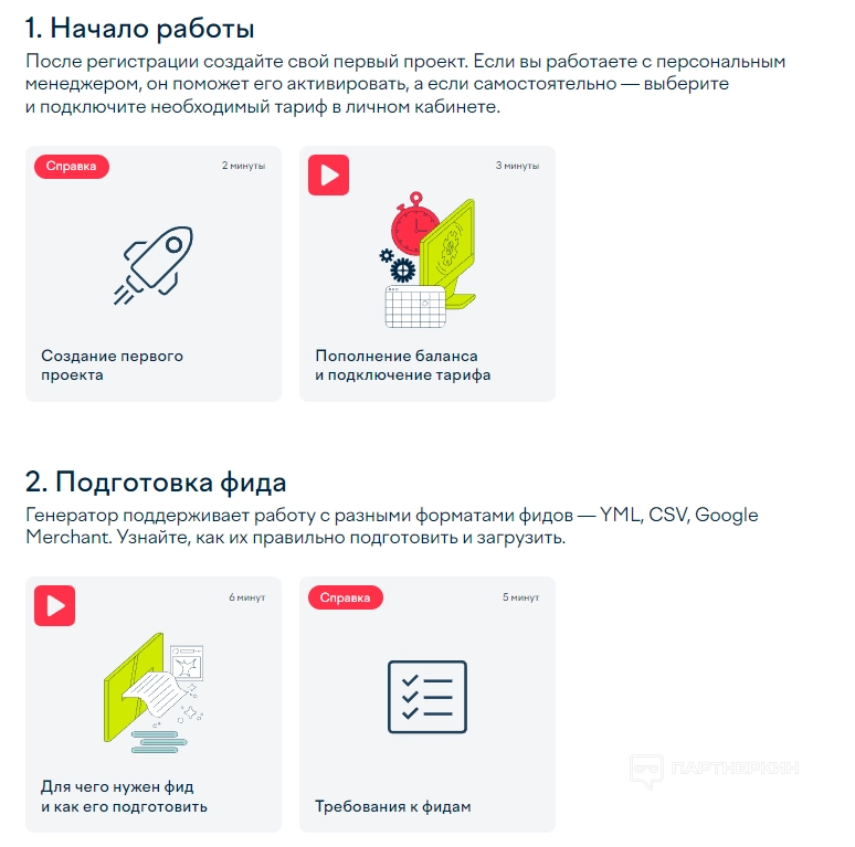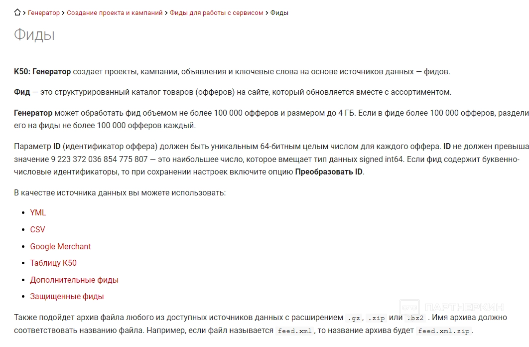 Требования к фидам можно прочитать в разделе «Генератор» — «Создание проекта и кампаний» — «Фиды для работы с сервисом» — «Фиды».