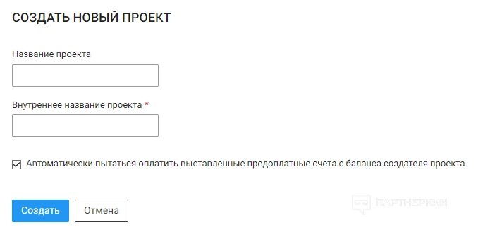 По желанию — включить или отключить опцию «автоматически пытаться оплатить выставленные предоплатные счета с баланса создателя проекта» и нажать кнопку «Создать».