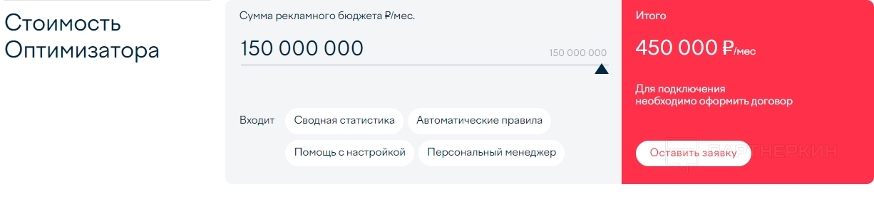 Стоимость Оптимизатора . Зависит от суммы рекламного бюджета в месяц. Можно установить значение от 10 000 тысяч до 15 000 000 миллионов рублей. В пакет входит сводная статистика, автоматические правила, помощь с настройкой и персональный менеджер.