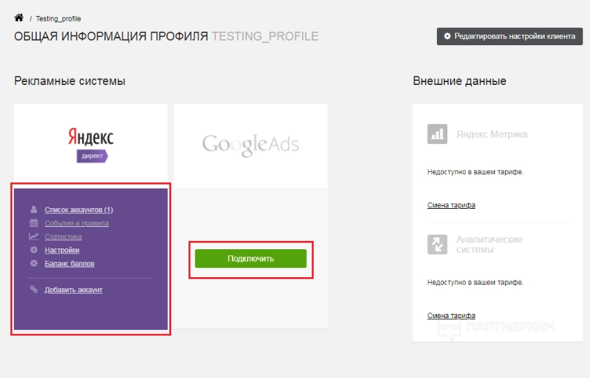 При подключении платного тарифа в столбце «Внешние данные» отобразится список аналитических и CRM-систем.