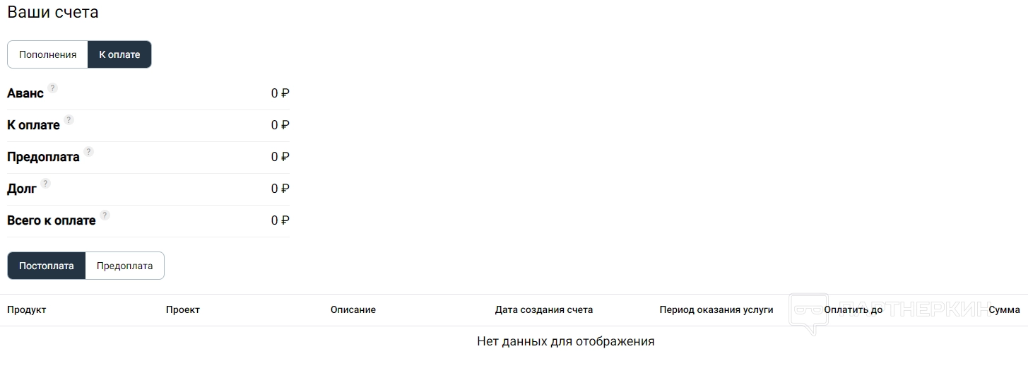 Здесь представлены все пополнения пользователя (ID, дата, сумма, описание). Во вкладке «К оплате» доступна следующая информация: