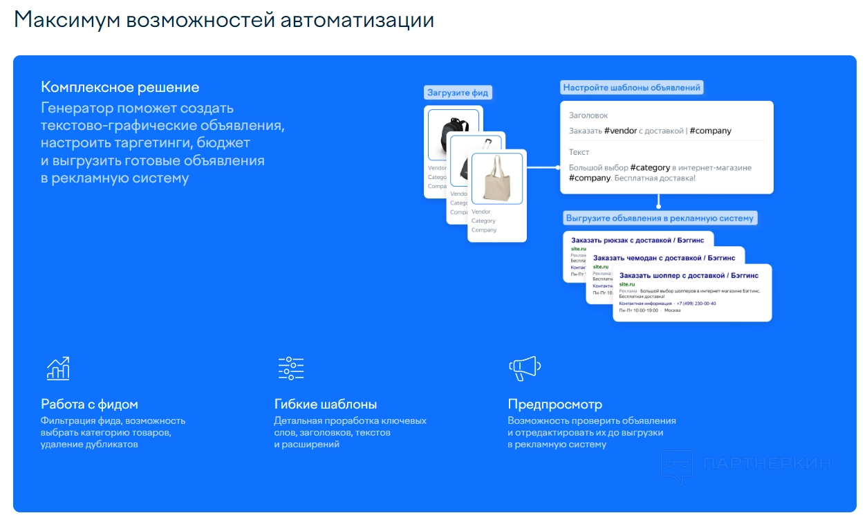 С помощью сервиса можно создавать и поддерживать актуальность рекламных кампаний в «Яндекс.Директе» и Google Ads на основе фидов YML/CSV в автоматическом режиме.