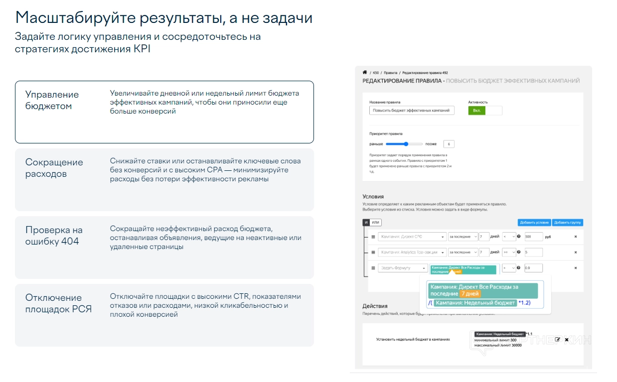 1. Оптимизация процессов. Пользователь может настроить управление ставками и мониторинг показателей, чтобы автоматически корректировать рекламные кампании и находить точки роста.