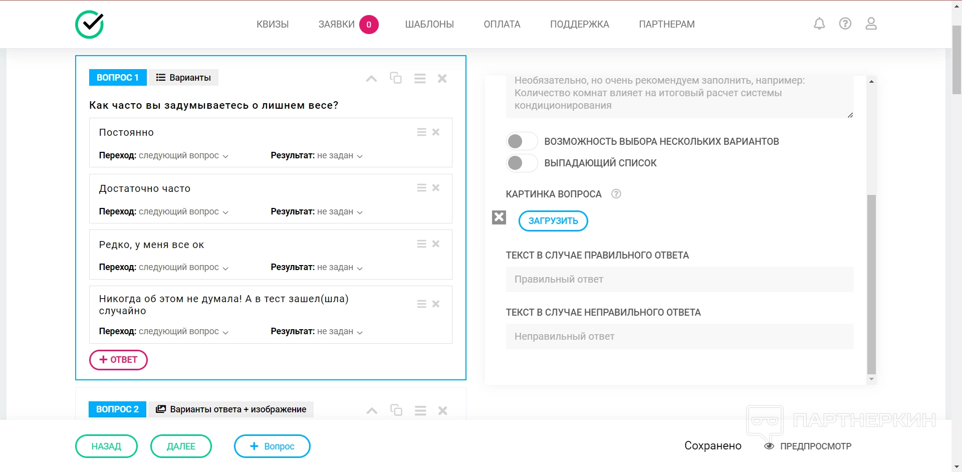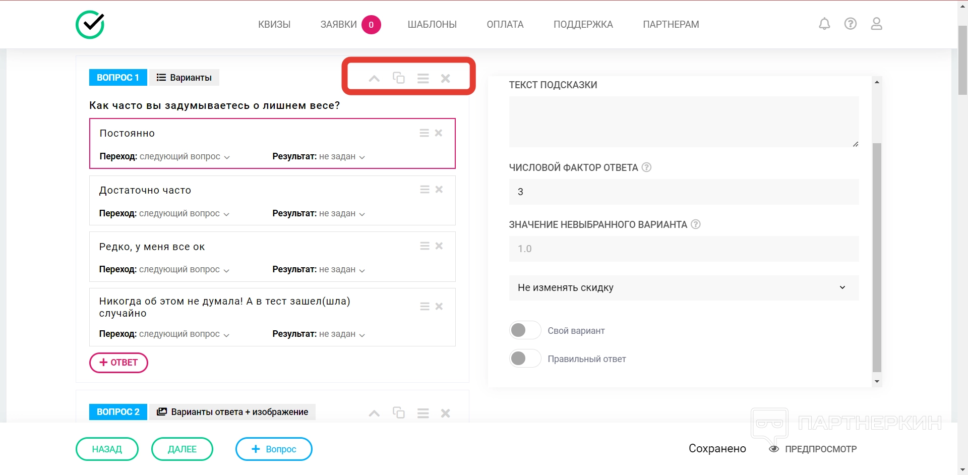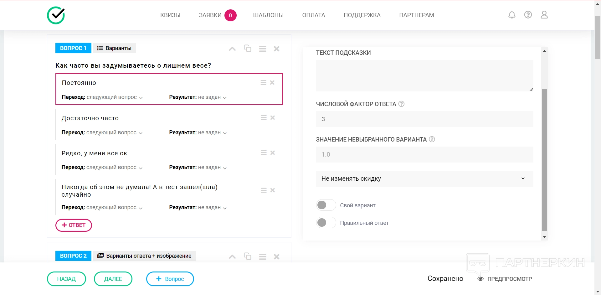 Если необходимо настроить не только вопрос, но и варианты ответа, достаточно тапнуть по одному из них и также указать все необходимые данные с правой стороны. Можно менять текст ответа, текст подсказки к ответу, числовой фактор, значение невыбранного варианта. Также можно отметить, будет ли ответ как-то влиять на скидку, и выбрать, может ли пользователь указывать свой ответ. Если нужно, один из ответов можно установить как правильный, чтобы респонденты это видели.