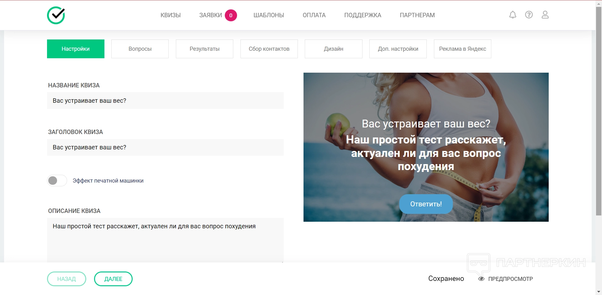 В любом случае пользователь попадает в один и тот же конструктор, где происходит настройка квиза. Причем первоначально нужно настроить базовые параметры — это название квиза, его заголовок, описание и текст на кнопке. Можно по необходимости подключить эффект печатной машинки для текста, а также добавить контактные данные.